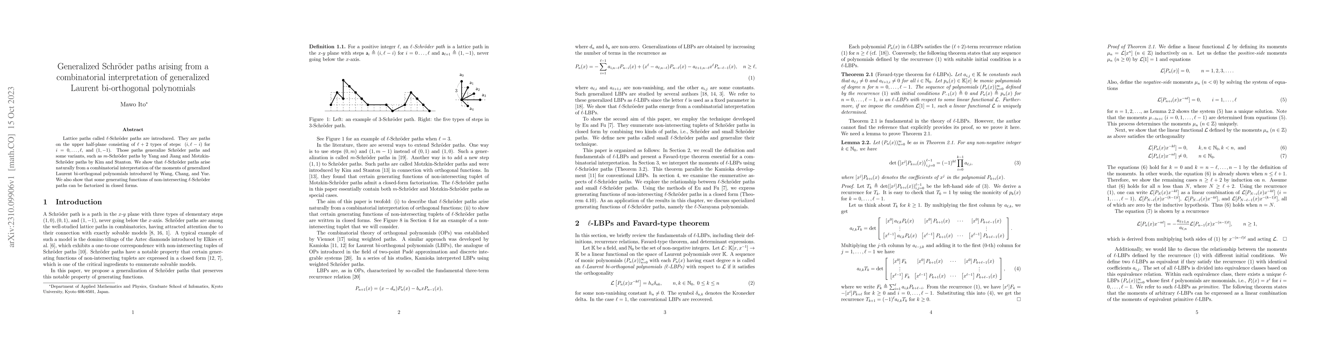 This paper introduces $\ell$-Schröder paths, a generalization of Schröder paths using $\ell+2$ types of steps, and demonstrates their combinatorial interpretation through the moments of generalized Laurent bi-orthogonal polynomials. It also provides closed-form factorizations for generating functions of non-intersecting $\ell$-Schröder paths.