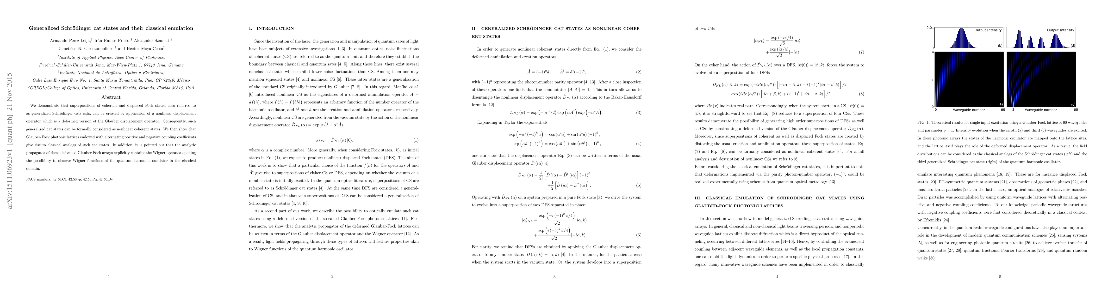This paper creates generalized Schrödinger cat states using a nonlinear displacement operator and demonstrates their classical emulation via Glauber-Fock photonic lattices with alternating coupling coefficients. It also highlights the presence of Wigner functions in the classical domain through the analytic propagator of these lattices.