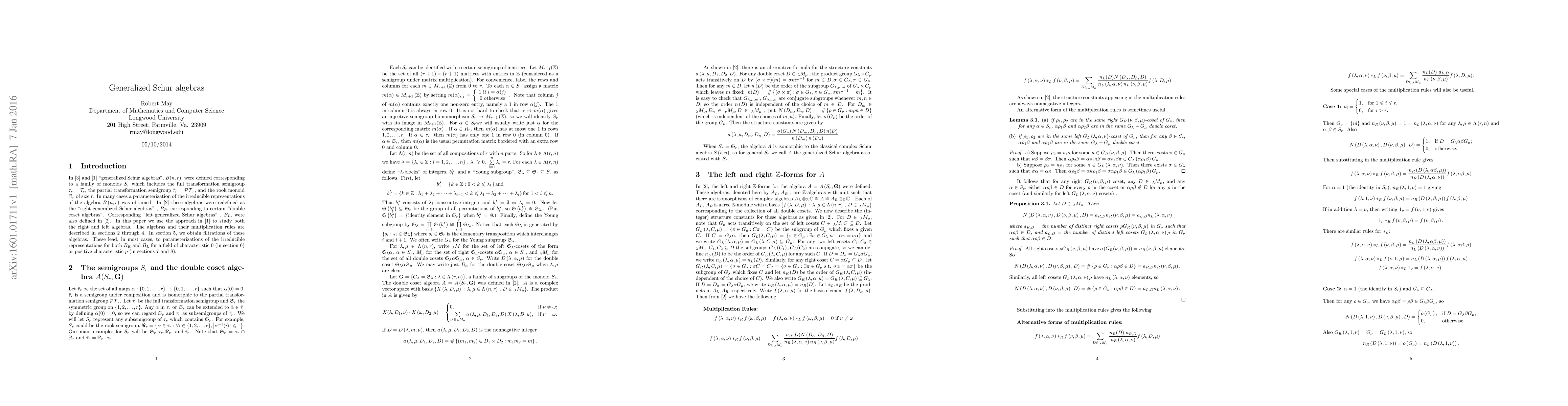 Left and right "generalized Schur algebras", previously introduced by the author, are defined and analyzed. Filtrations of these algebras lead, in most cases, to parameterizations of the their irreducible representations over fields of characteristic 0 and fields of positive characteristic p.