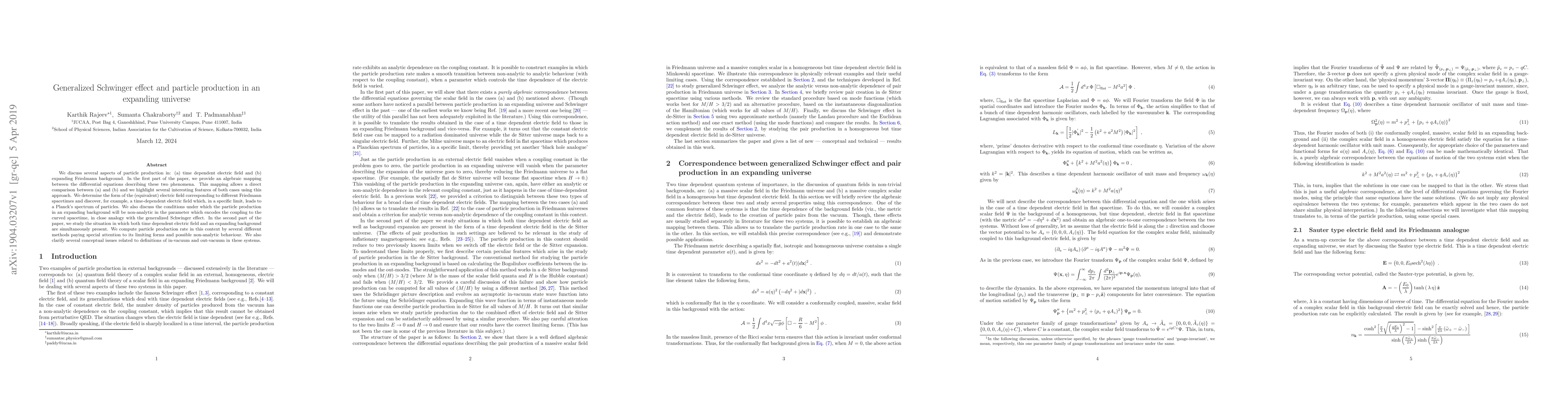 We discuss several aspects of particle production in: (a) time dependent electric field and (b) expanding Friedmann background. In the first part of the paper, we provide an algebraic mapping between the differential equations describing these two phenomena. This mapping allows a direct comparison between (a) and (b) and we highlight several interesting features of both cases using this approach. We determine the form of the (equivalent) electric field corresponding to different Friedmann spacetimes and discover, for example, a time-dependent electric field which, in a specific limit, leads to a Planck's spectrum of particles. We also discuss the conditions under which the particle production in an expanding background will be non-analytic in the parameter which encodes the coupling to the curved spacetime, in close analogy with the generalized Schwinger effect. In the second part of the paper, we study the situation in which both time dependent electric field and an expanding background are simultaneously present. We compute particle production rate in this context by several different methods paying special attention to its limiting forms and possible non-analytic behaviour. We also clarify several conceptual issues related to definitions of in-vacuum and out-vacuum in these systems.