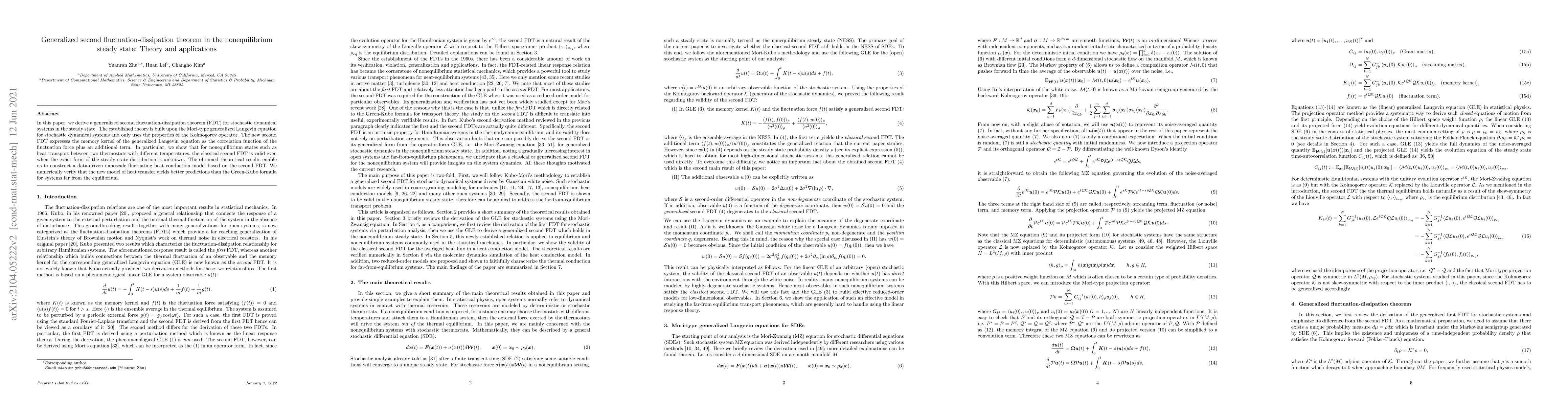 This paper derives a generalized second fluctuation-dissipation theorem for stochastic dynamical systems in nonequilibrium steady states, using the Mori-type generalized Langevin equation. The new theorem provides a memory kernel expression and validates classical second FDT even for unknown steady state distributions, enabling improved nanoscale heat conduction modeling.