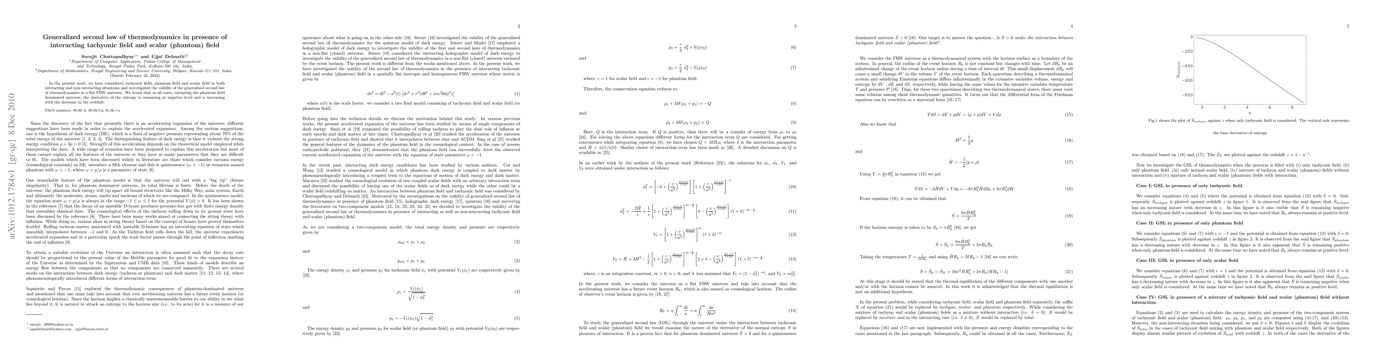 This paper examines the generalized second law of thermodynamics in a flat FRW universe with tachyonic and scalar fields, both interacting and non-interacting. It finds that, except in phantom field dominated scenarios, entropy's derivative remains negative and increases with decreasing redshift.