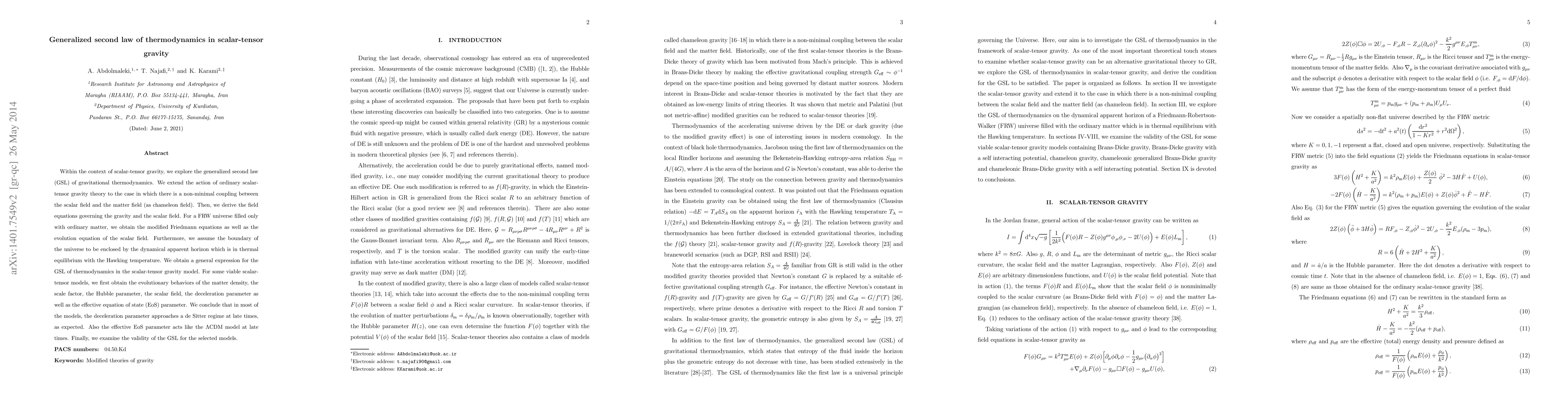 This paper investigates the generalized second law of thermodynamics within scalar-tensor gravity, deriving modified Friedmann equations and the evolution of a scalar field coupled non-minimally with matter. It concludes that most models exhibit a de Sitter regime and effective equation of state behavior akin to LCDM, validating the generalized second law.