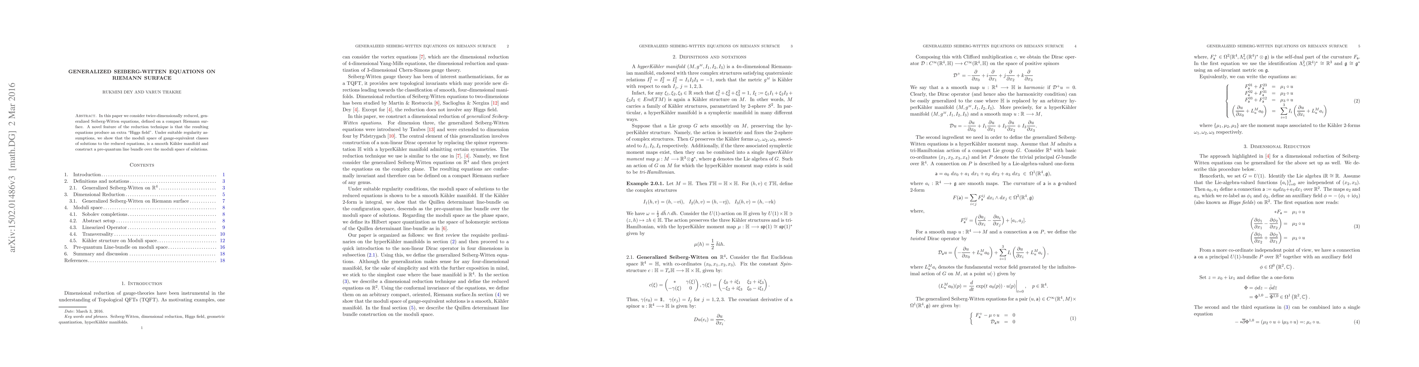 This paper explores generalized Seiberg-Witten equations on compact Riemann surfaces, introducing a novel reduction technique that produces an additional "Higgs field." Under regularity assumptions, it demonstrates that the moduli space of solutions is a smooth Kähler manifold and constructs a pre-quantum line bundle over this space.