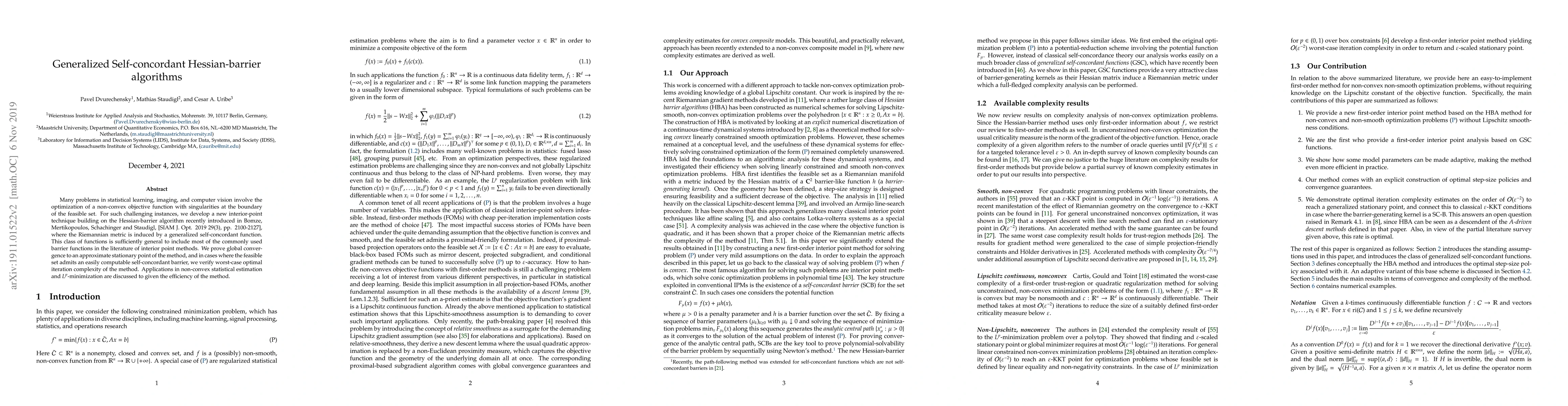 Many problems in statistical learning, imaging, and computer vision involve the optimization of a non-convex objective function with singularities at the boundary of the feasible set. For such challenging instances, we develop a new interior-point technique building on the Hessian-barrier algorithm recently introduced in Bomze, Mertikopoulos, Schachinger and Staudigl, [SIAM J. Opt. 2019 29(3), pp. 2100-2127], where the Riemannian metric is induced by a generalized self-concordant function. This class of functions is sufficiently general to include most of the commonly used barrier functions in the literature of interior point methods. We prove global convergence to an approximate stationary point of the method, and in cases where the feasible set admits an easily computable self-concordant barrier, we verify worst-case optimal iteration complexity of the method. Applications in non-convex statistical estimation and $L^{p}$-minimization are discussed to given the efficiency of the method.