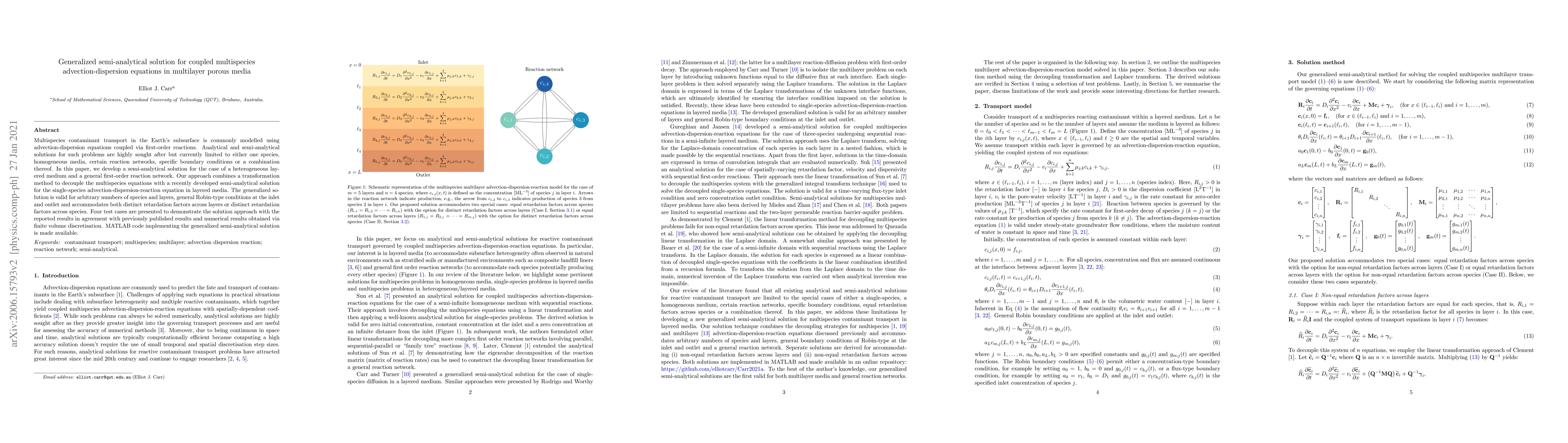 This paper develops a generalized semi-analytical solution for multispecies contaminant transport in multilayer porous media, addressing limitations of existing models by accommodating heterogeneous layers, general reaction networks, and various boundary conditions. The approach combines a transformation method and a semi-analytical solution for single-species transport, validated through test cases.