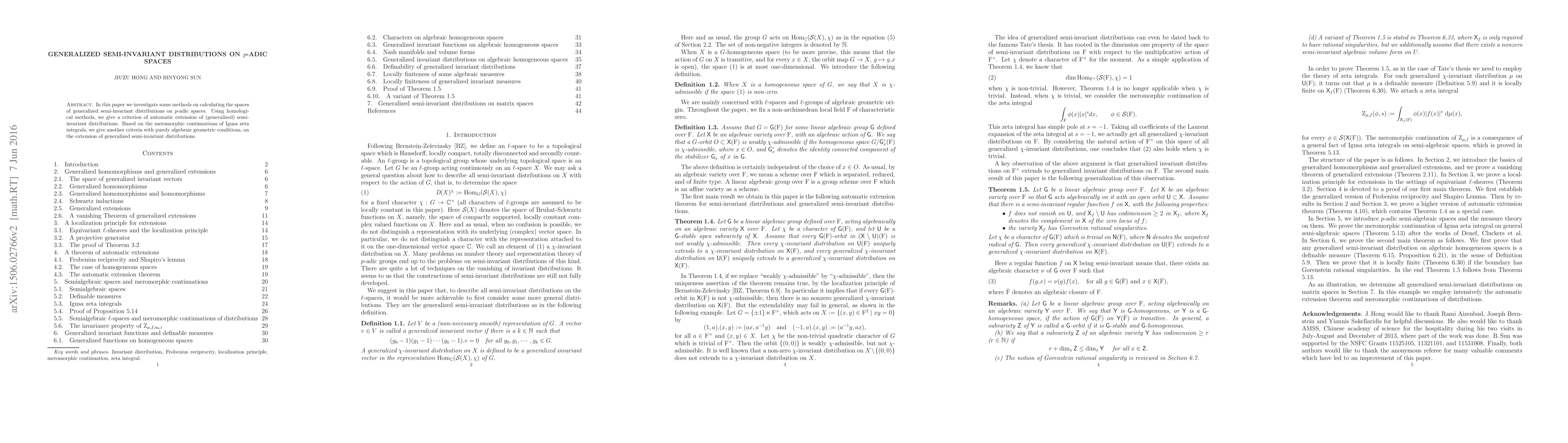 This paper explores methods for calculating generalized semi-invariant distributions on p-adic spaces, providing criteria for automatic extension using homological techniques and algebraic geometric conditions based on Igusa zeta integrals.