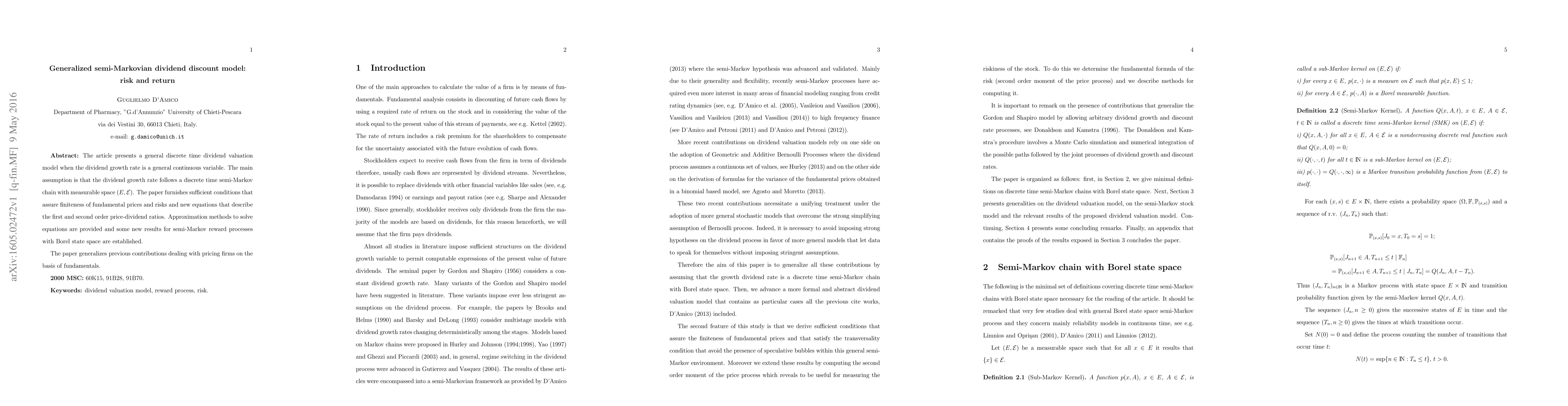 This paper introduces a generalized dividend discount model that incorporates semi-Markov chains for continuous dividend growth rates, providing new equations and approximation methods to solve them. It aims to generalize previous contributions on pricing firms based on fundamentals.