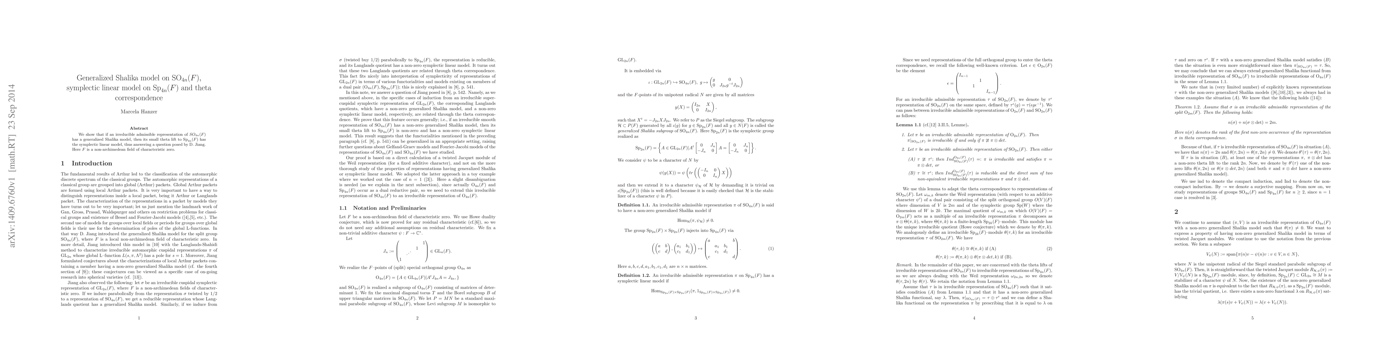 We show that if an irreducible admissible representation of $\mathrm{SO}_{4n}(F)$ has a generalized Shalika model, then its small theta lift to $\mathrm{Sp}_{4n}(F)$ has the symplectic linear model, thus answering a question posed by D. Jiang. Here $F$ is a non-archimedean field of characteristic zero.