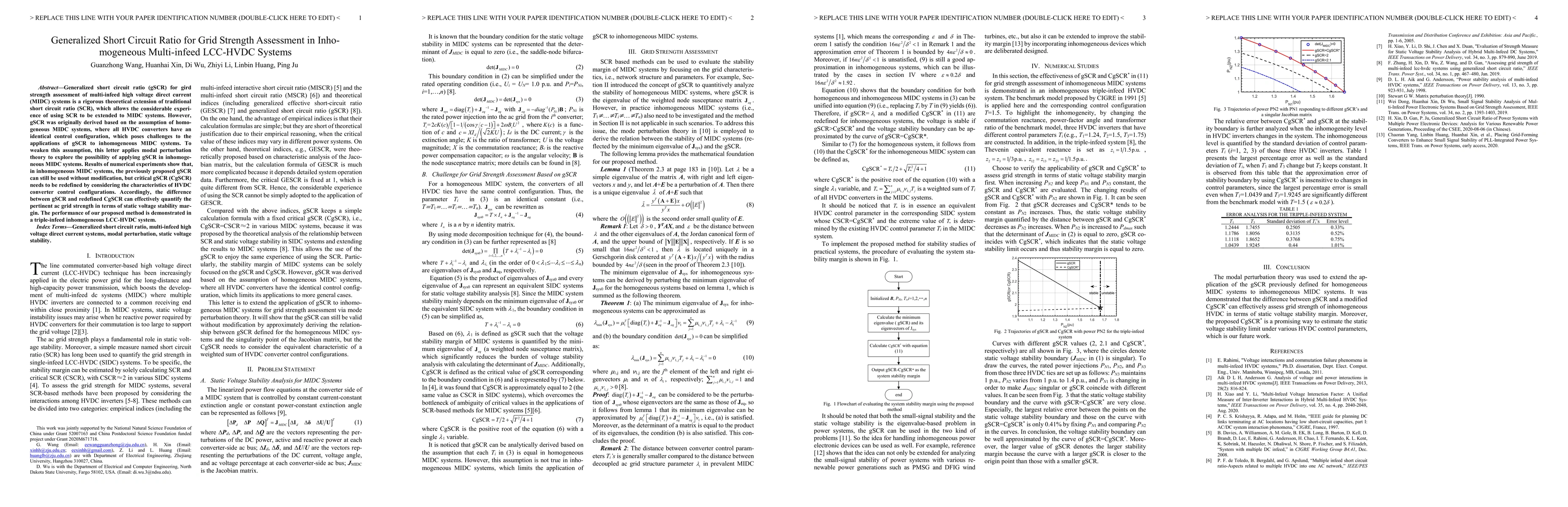 Generalized short circuit ratio (gSCR) for gird strength assessment of multi-infeed high voltage direct current (MIDC) systems is a rigorous theoretical extension of traditional short circuit ratio (SCR), which allows the considerable experience of using SCR to be extended to MIDC systems. However, gSCR was originally derived based on the assumption of homogeneous MIDC systems, where all HVDC converters have an identical control configuration, which poses challenges to the applications of gSCR to inhomogeneous MIDC systems. To weaken this assumption, this letter applies modal perturbation theory to explore the possibility of applying gSCR in inhomogeneous MIDC systems. Results of numerical experiments show that, in inhomogeneous MIDC systems, the previously proposed gSCR can still be used without modification, but critical gSCR (CgSCR) needs to be redefined by considering the characteristics of HVDC converter control configurations. Accordingly, the difference between gSCR and redefined CgSCR can effectively quantify the pertinent ac grid strength in terms of static voltage stability margin. The performance of our proposed method is demonstrated in a triple-infeed inhomogeneous LCC-HVDC system.