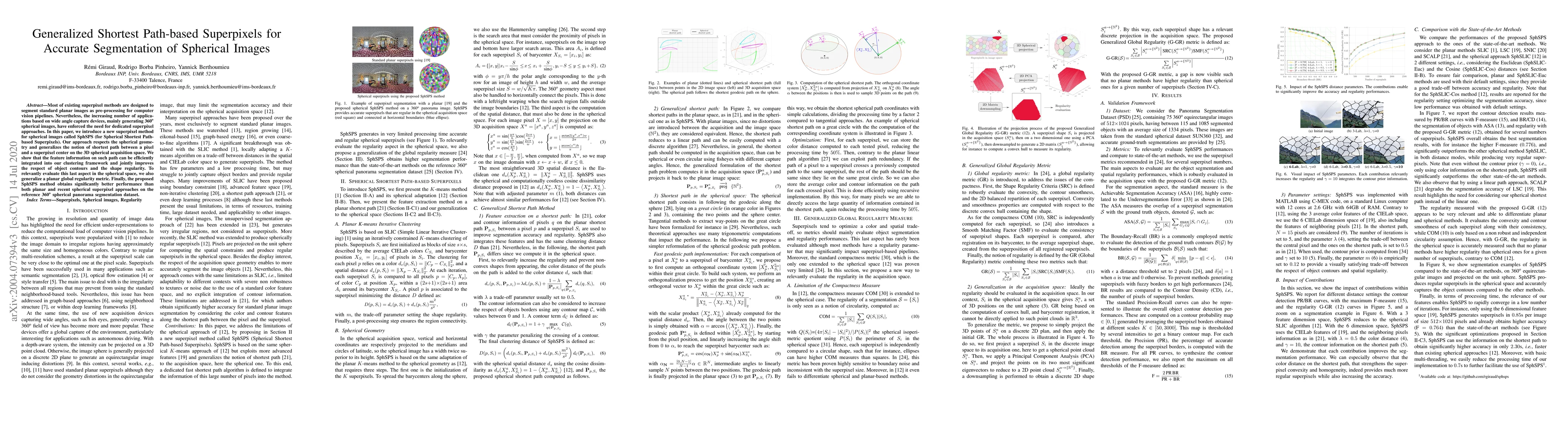 Most of existing superpixel methods are designed to segment standard planar images as pre-processing for computer vision pipelines. Nevertheless, the increasing number of applications based on wide angle capture devices, mainly generating 360{\deg} spherical images, have enforced the need for dedicated superpixel approaches. In this paper, we introduce a new superpixel method for spherical images called SphSPS (for Spherical Shortest Path-based Superpixels). Our approach respects the spherical geometry and generalizes the notion of shortest path between a pixel and a superpixel center on the 3D spherical acquisition space. We show that the feature information on such path can be efficiently integrated into our clustering framework and jointly improves the respect of object contours and the shape regularity. To relevantly evaluate this last aspect in the spherical space, we also generalize a planar global regularity metric. Finally, the proposed SphSPS method obtains significantly better performance than both planar and recent spherical superpixel approaches on the reference 360{\deg} spherical panorama segmentation dataset.