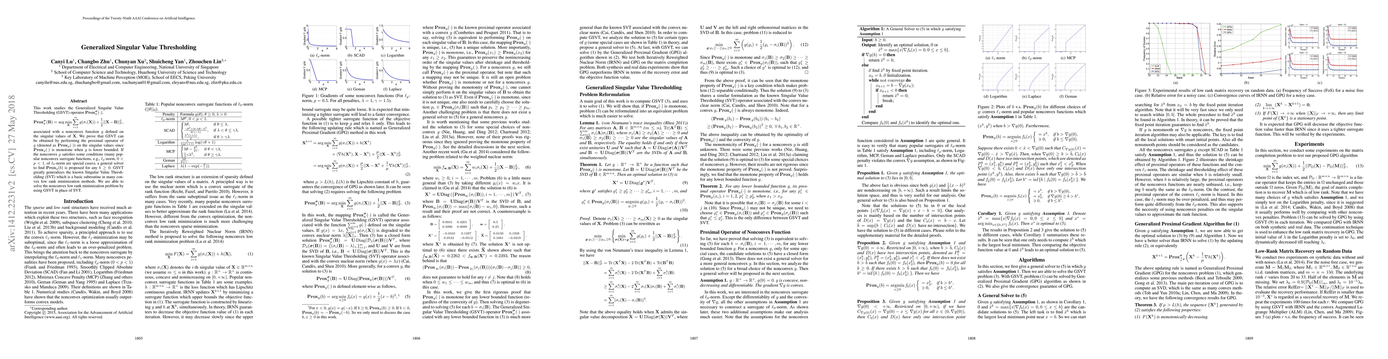 This paper introduces the Generalized Singular Value Thresholding (GSVT) operator, which generalizes the Singular Value Thresholding (SVT) method. It provides a framework to solve nonconvex low rank minimization problems by applying the proximal operator on the singular values under certain conditions.