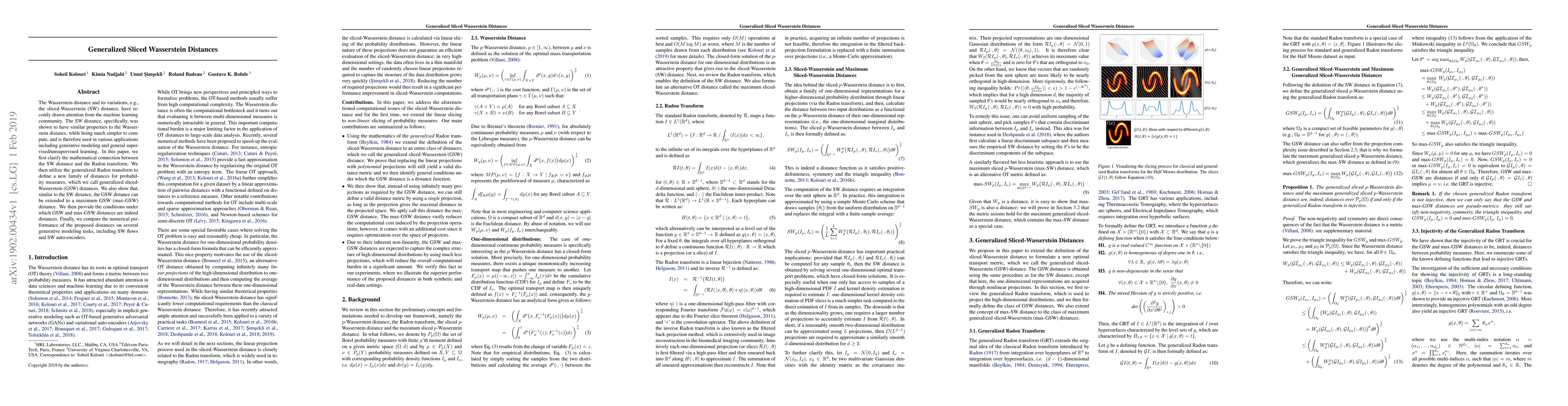 This paper introduces generalized sliced-Wasserstein (GSW) distances, extending the sliced-Wasserstein distance using the generalized Radon transform, and demonstrates their applicability in generative modeling tasks. The authors also establish conditions under which GSW distances are valid and compare their performance to existing methods.