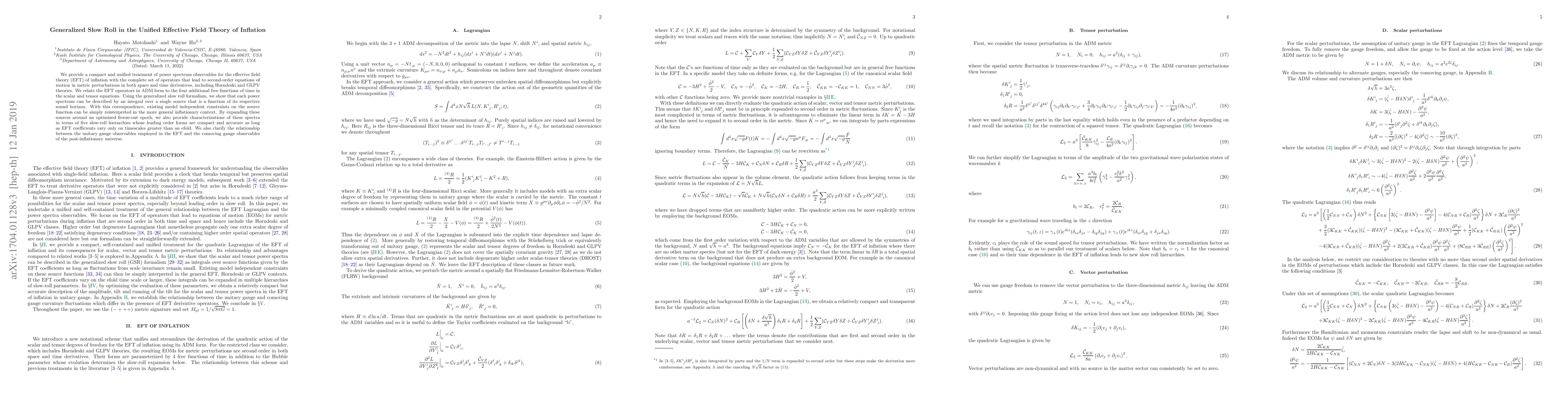 This paper presents a unified treatment of the effective field theory (EFT) of inflation, incorporating Horndeski and GLPV theories, and uses the generalized slow roll formalism to describe power spectra through integrals over source functions. It characterizes inflationary spectra in terms of five slow-roll hierarchies and clarifies the relationship between EFT and post-inflationary universe observables.