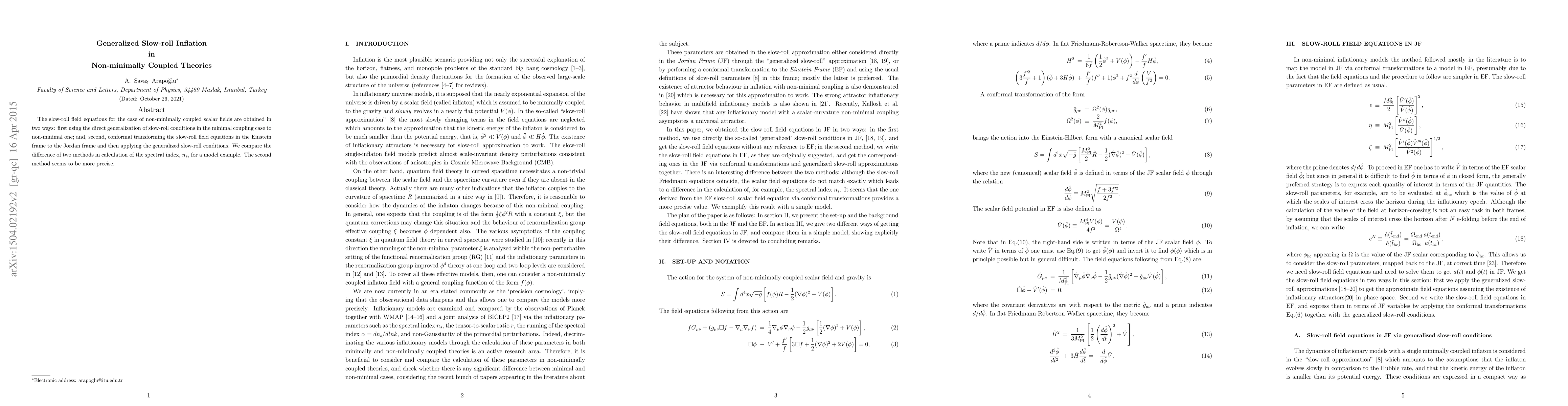 This paper investigates the generalized slow-roll inflation for non-minimally coupled scalar fields, comparing two methods for calculating the spectral index $n_s$. The first method directly generalizes slow-roll conditions from minimal coupling, while the second involves conformal transformation and application of generalized conditions. The second method appears more precise.