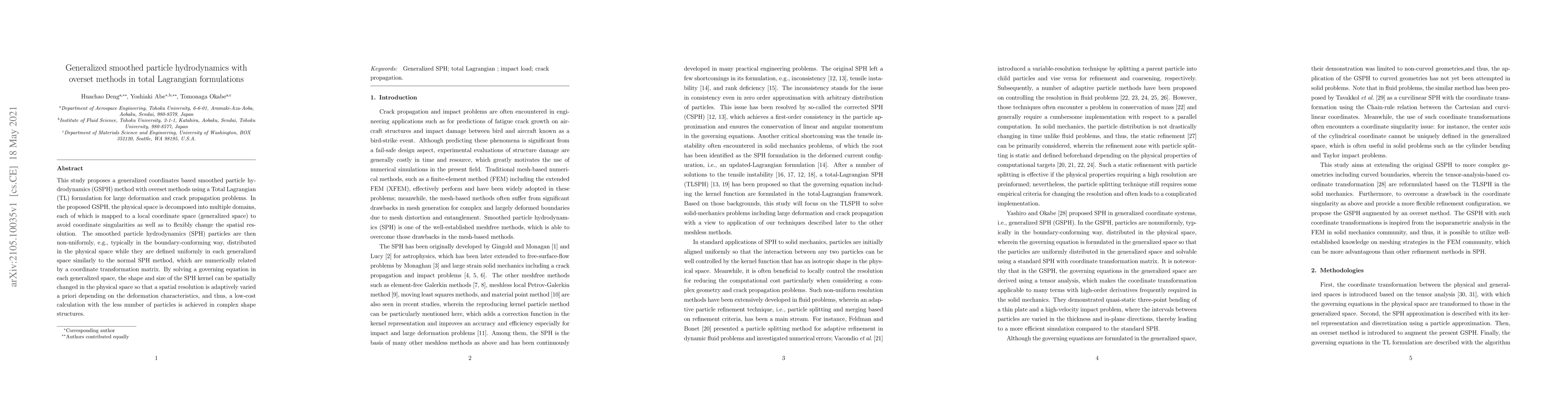 This study proposes a generalized coordinates based smoothed particle hydrodynamics (GSPH) method with overset methods using a Total Lagrangian (TL) formulation for large deformation and crack propagation problems. In the proposed GSPH, the physical space is decomposed into multiple domains, each of which is mapped to a local coordinate space (generalized space) to avoid coordinate singularities as well as to flexibly change the spatial resolution. The smoothed particle hydrodynamics (SPH) particles are then non-uniformly, e.g., typically in the boundary-conforming way, distributed in the physical space while they are defined uniformly in each generalized space similarly to the normal SPH method, which are numerically related by a coordinate transformation matrix. By solving a governing equation in each generalized space, the shape and size of the SPH kernel can be spatially changed in the physical space so that a spatial resolution is adaptively varied a priori depending on the deformation characteristics, and thus, a low-cost calculation with the less number of particles is achieved in complex shape structures.