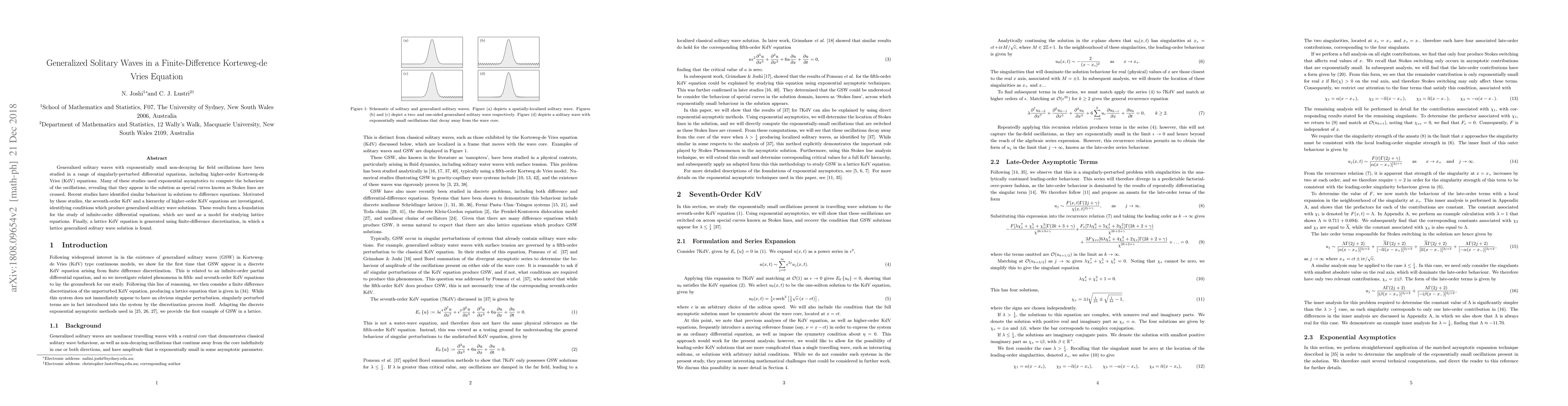 This paper investigates generalized solitary waves in higher-order Korteweg-de Vries (KdV) equations, identifying conditions for their existence and exploring their behavior using exponential asymptotics. It extends these findings to finite-difference discretizations, generating a lattice KdV equation and finding a lattice generalized solitary wave solution.