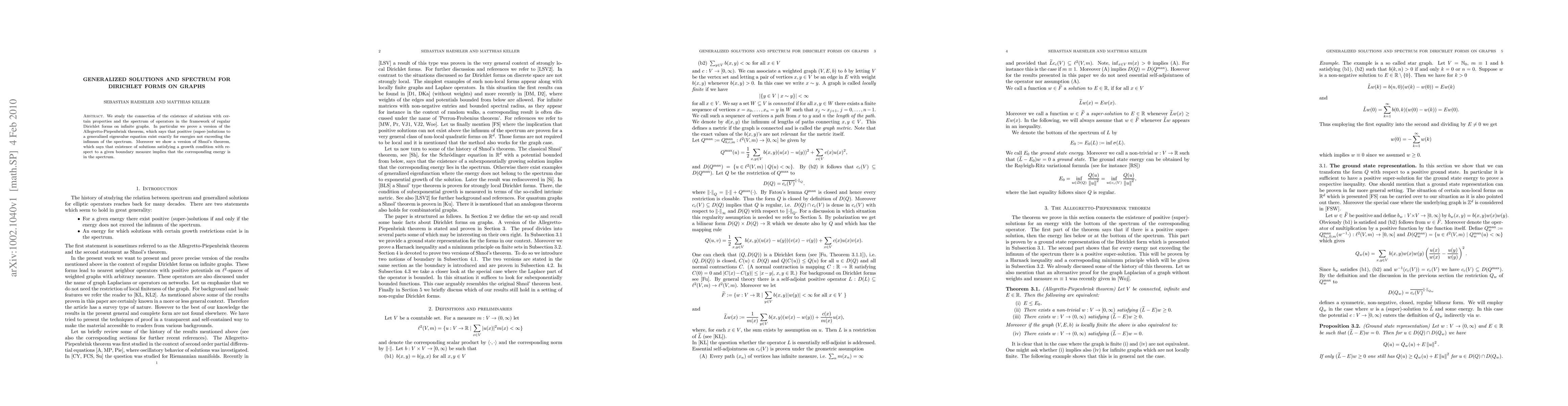 We study the connection of the existence of solutions with certain properties and the spectrum of operators in the framework of regular Dirichlet forms on infinite graphs. In particular we prove a version of the Allegretto-Piepenbrink theorem, which says that positive (super-)solutions to a generalized eigenvalue equation exist exactly for energies not exceeding the infimum of the spectrum. Moreover we show a version of Shnol's theorem, which says that existence of solutions satisfying a growth condition with respect to a given boundary measure implies that the corresponding energy is in the spectrum.
