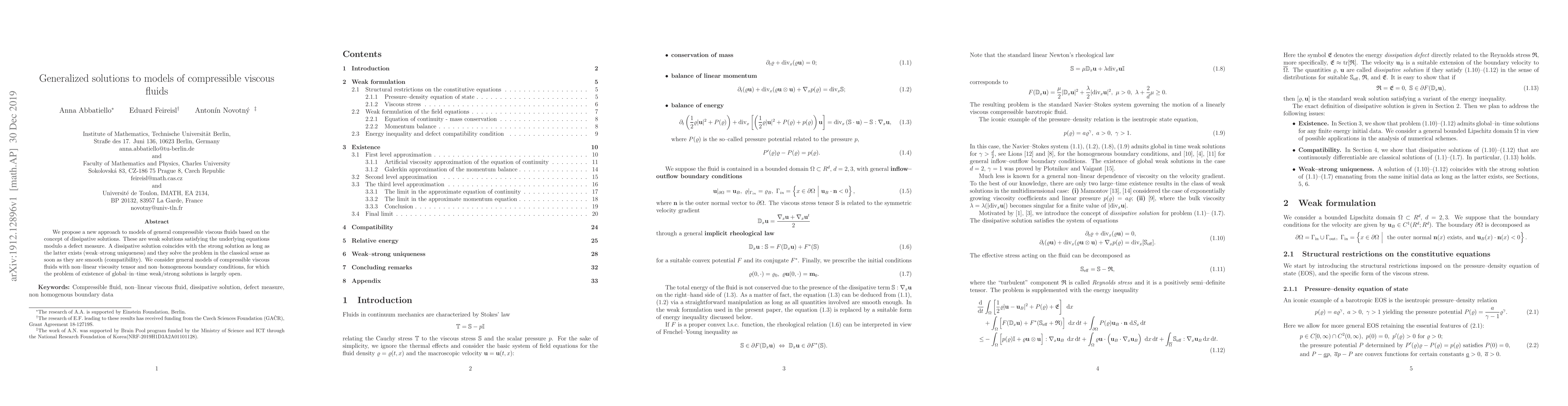 The paper proposes a new approach to models of compressible viscous fluids based on dissipative solutions, which are weak solutions satisfying the underlying equations modulo a defect measure. The approach ensures weak-strong uniqueness and compatibility with smooth solutions.