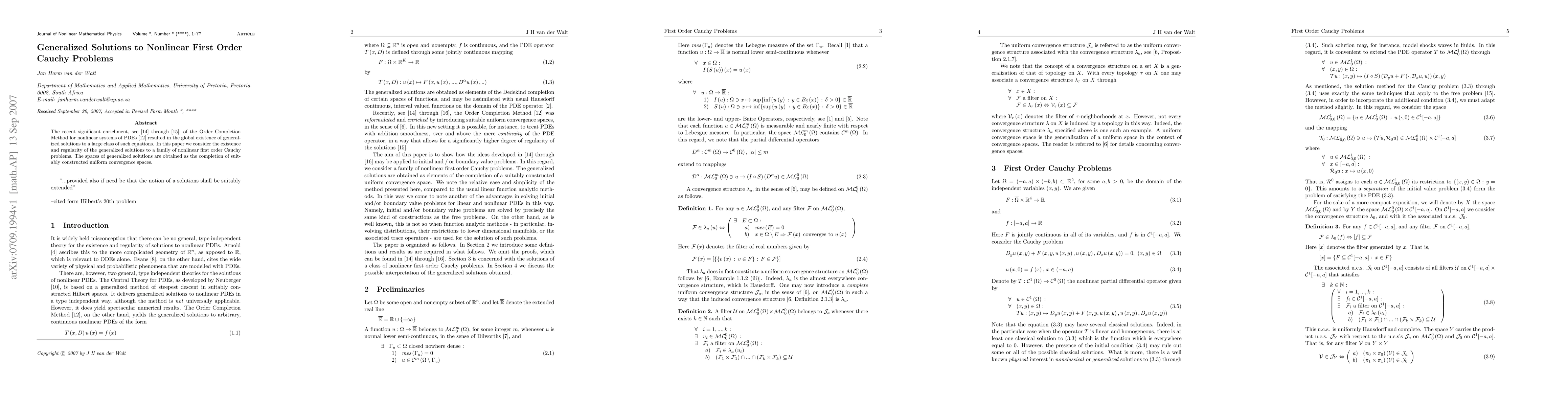 This paper explores the existence and regularity of generalized solutions to nonlinear first order Cauchy problems using the enriched Order Completion Method for nonlinear PDE systems. The generalized solutions are derived from the completions of uniform convergence spaces.