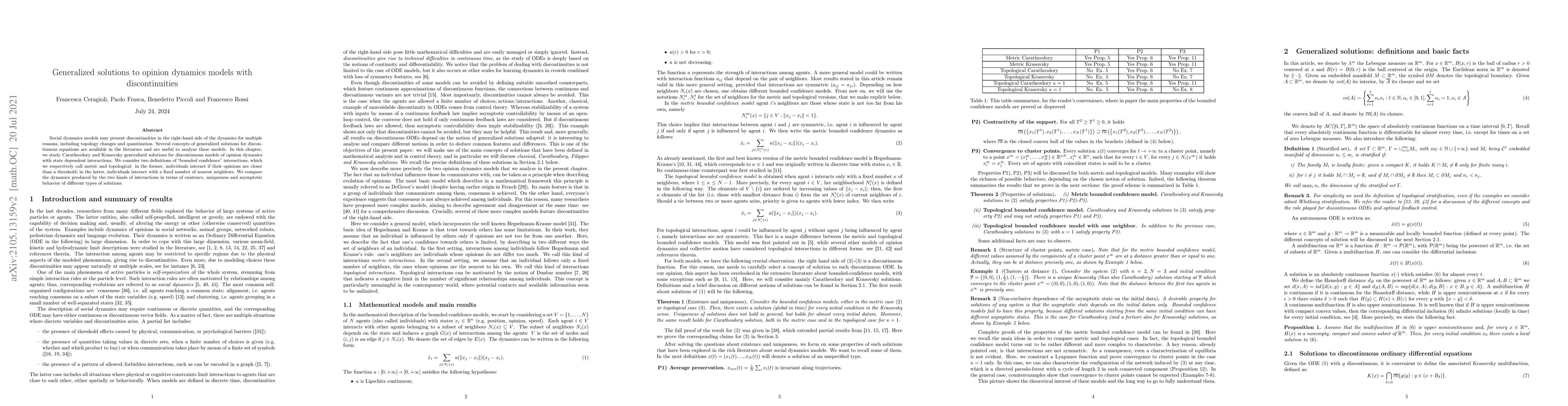 This paper explores generalized solutions for discontinuous opinion dynamics models, specifically focusing on Caratheodory and Krasovsky solutions. It compares the dynamics of "bounded confidence" interactions defined metrically and topologically, examining their existence, uniqueness, and asymptotic behavior.