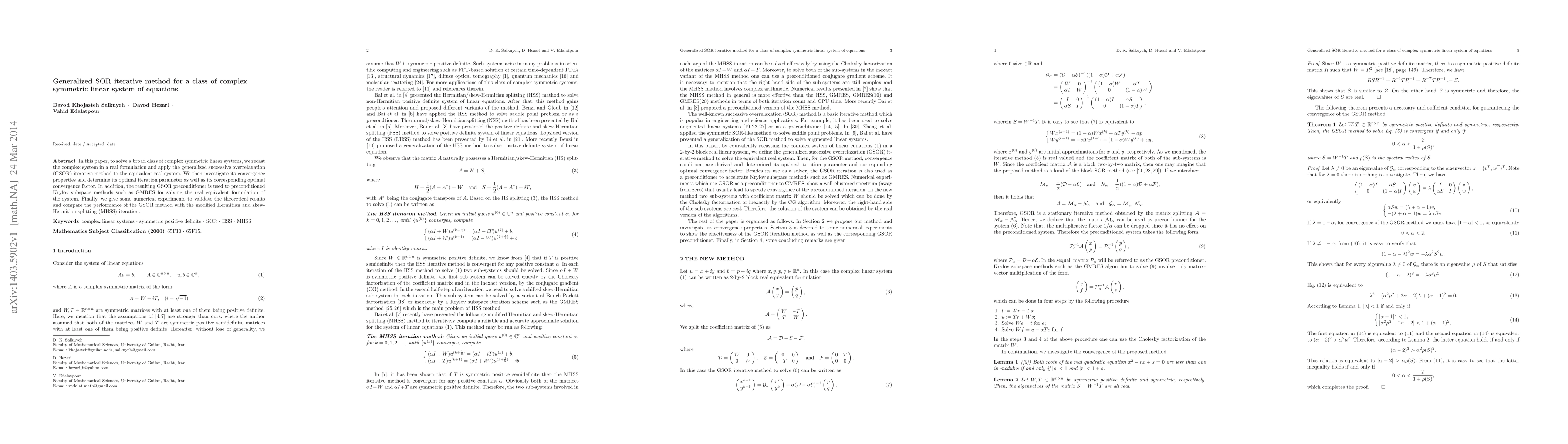 This paper proposes a generalized successive overrelaxation (GSOR) iterative method for solving complex symmetric linear systems by reformulating them into real equivalents. It investigates the convergence properties, optimal parameters, and applies the GSOR preconditioner to Krylov subspace methods like GMRES, concluding with numerical experiments comparing GSOR to the modified Hermitian and skew-Hermitian splitting (MHSS) iteration.