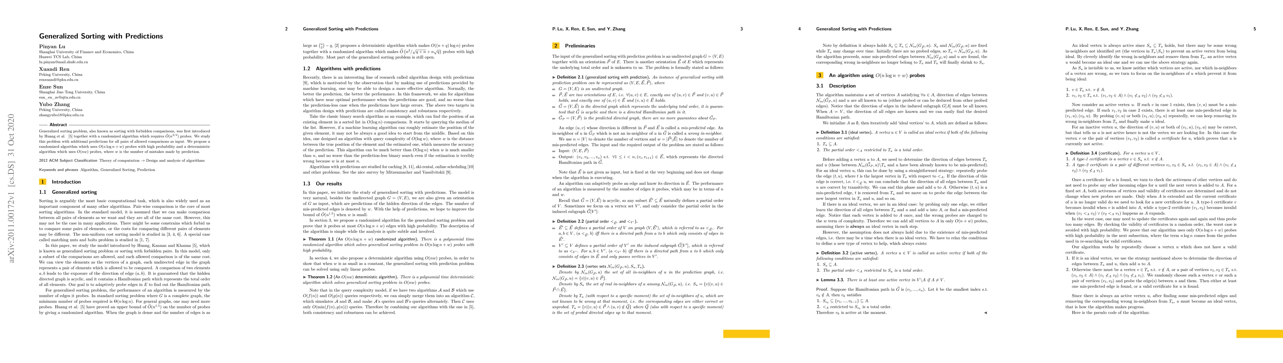 This paper addresses the generalized sorting problem with predictions, proposing a randomized algorithm that requires $O(n \log n+w)$ probes and a deterministic algorithm that uses $O(nw)$ probes, where $w$ represents the prediction mistakes.
