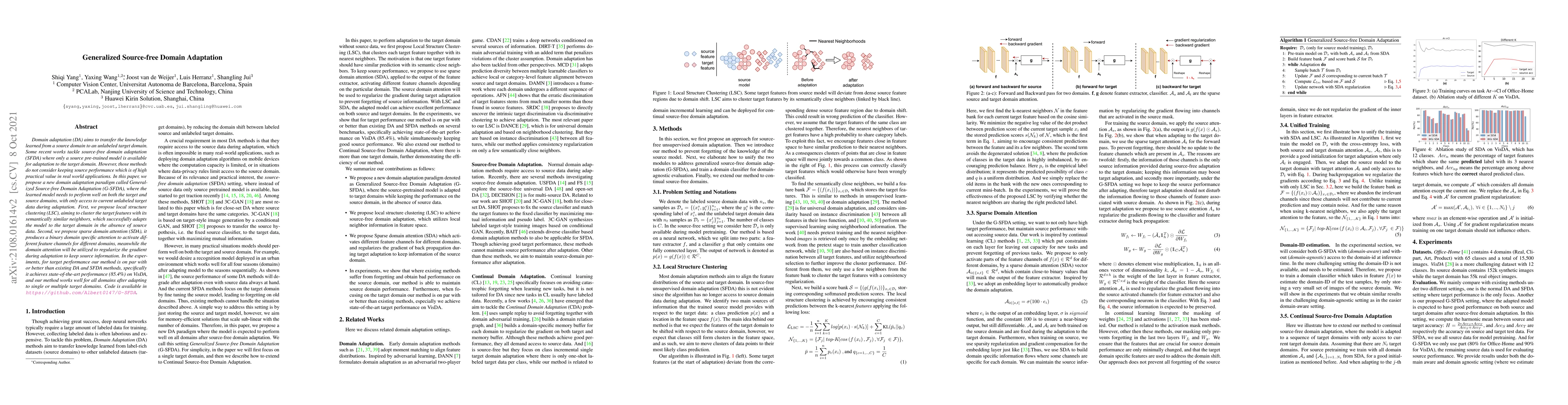 This paper introduces Generalized Source-free Domain Adaptation (G-SFDA), a new paradigm for domain adaptation that maintains performance on both source and target domains without using source data. The proposed method uses local structure clustering and sparse domain attention to adapt the model to the target domain while preserving source information.