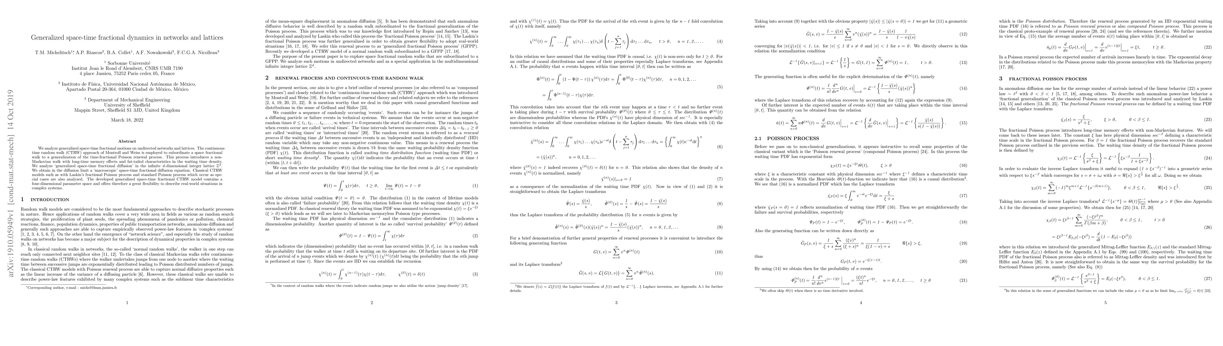 We analyze generalized space-time fractional motions on undirected networks and lattices. The continuous-time random walk (CTRW) approach of Montroll and Weiss is employed to subordinate a space fractional walk to a generalization of the time-fractional Poisson renewal process. This process introduces a non-Markovian walk with long-time memory effects and fat-tailed characteristics in the waiting time density. We analyze `generalized space-time fractional diffusion' in the infinite $\it d$-dimensional integer lattice $\it \mathbb{Z}^d$. We obtain in the diffusion limit a `macroscopic' space-time fractional diffusion equation. Classical CTRW models such as with Laskin's fractional Poisson process and standard Poisson process which occur as special cases are also analyzed. The developed generalized space-time fractional CTRW model contains a four-dimensional parameter space and offers therefore a great flexibility to describe real-world situations in complex systems.