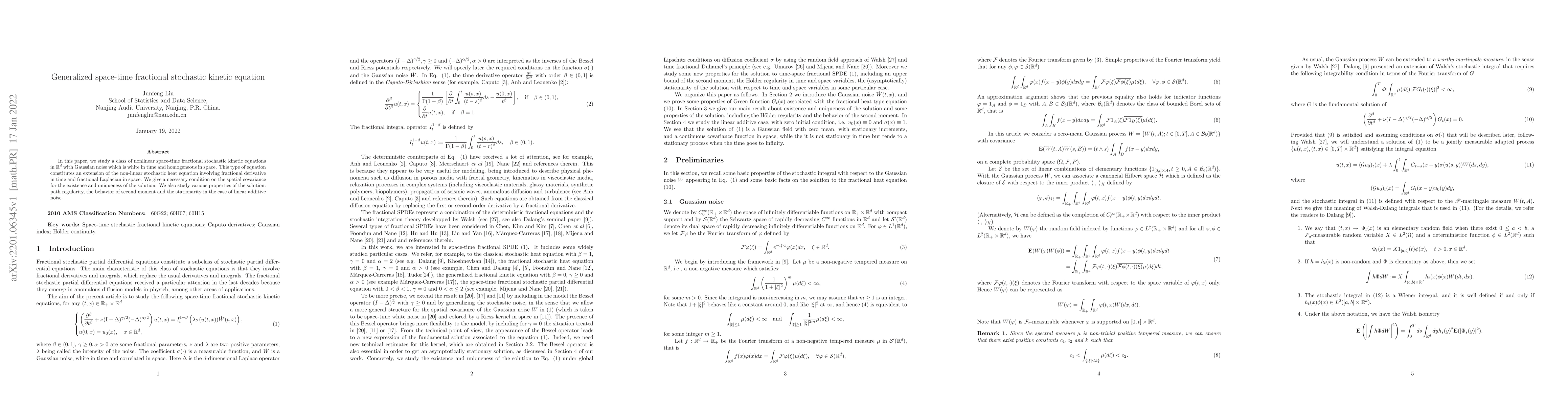 This paper investigates nonlinear space-time fractional stochastic kinetic equations in $\mathbb{R}^d$ with Gaussian noise, extending the non-linear stochastic heat equation. It establishes conditions for solution existence and uniqueness, and examines properties like path regularity and second moment behavior.