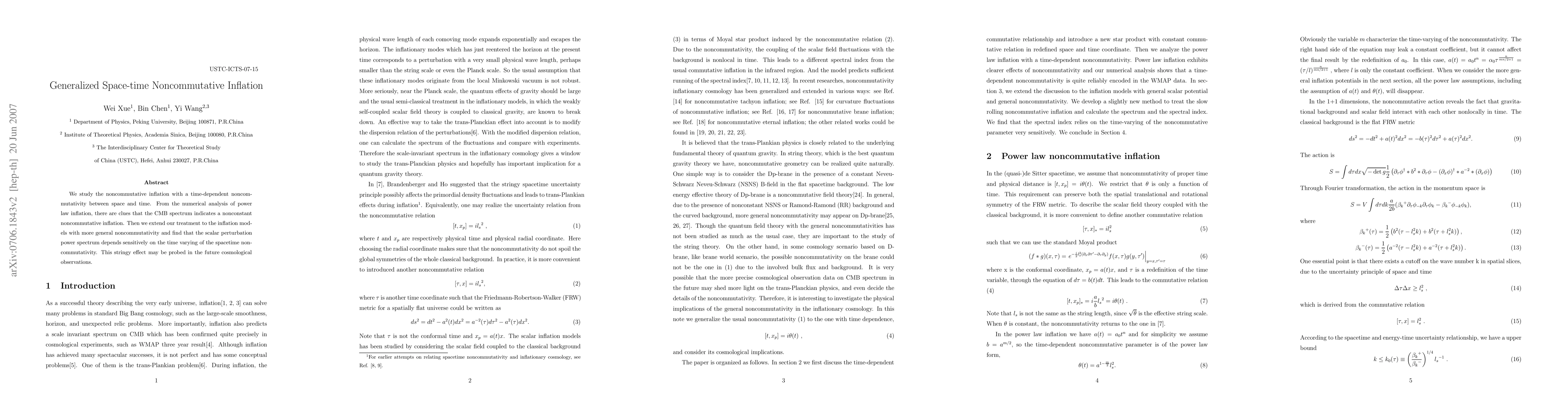 We study the noncommutative inflation with a time-dependent noncommutativity between space and time. From the numerical analysis of power law inflation, there are clues that the CMB spectrum indicates a nonconstant noncommutative inflation. Then we extend our treatment to the inflation models with more general noncommutativity and find that the scalar perturbation power spectrum depends sensitively on the time varying of the spacetime noncommutativity. This stringy effect may be probed in the future cosmological observations.