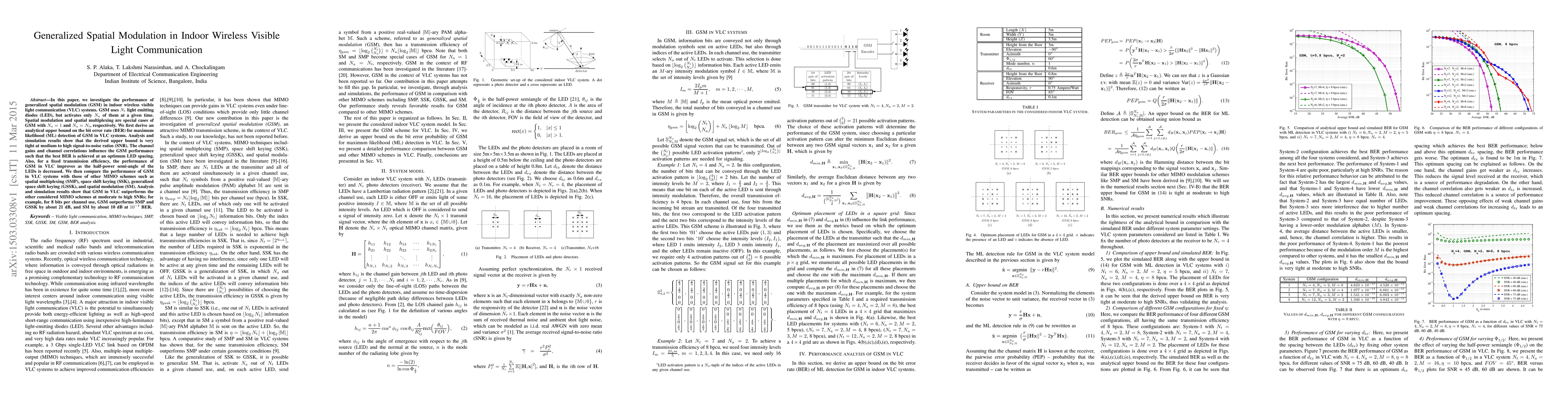 This paper investigates the performance of generalized spatial modulation (GSM) in indoor visible light communication (VLC) systems, deriving an analytical upper bound on bit error rate (BER) for GSM. The study finds that GSM outperforms other MIMO schemes like spatial multiplexing and spatial modulation, especially at moderate to high signal-to-noise ratios.