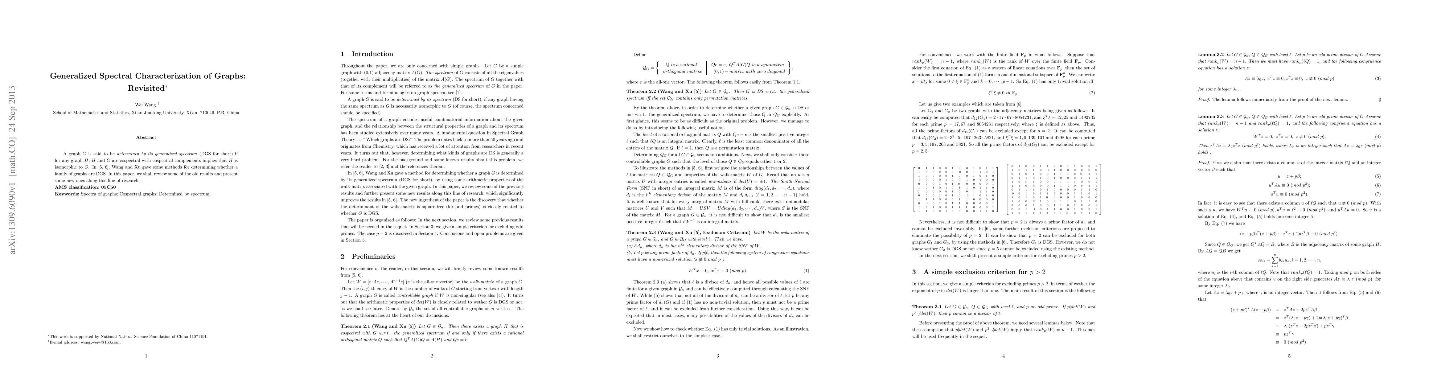 A graph $G$ is said to be \textit{determined by its generalized spectrum} (DGS for short) if for any graph $H$, $H$ and $G$ are cospectral with cospectral complements implies that $H$ is isomorphic to $G$. In \cite{WX,WX1}, Wang and Xu gave some methods for determining whether a family of graphs are DGS. In this paper, we shall review some of the old results and present some new ones along this line of research.