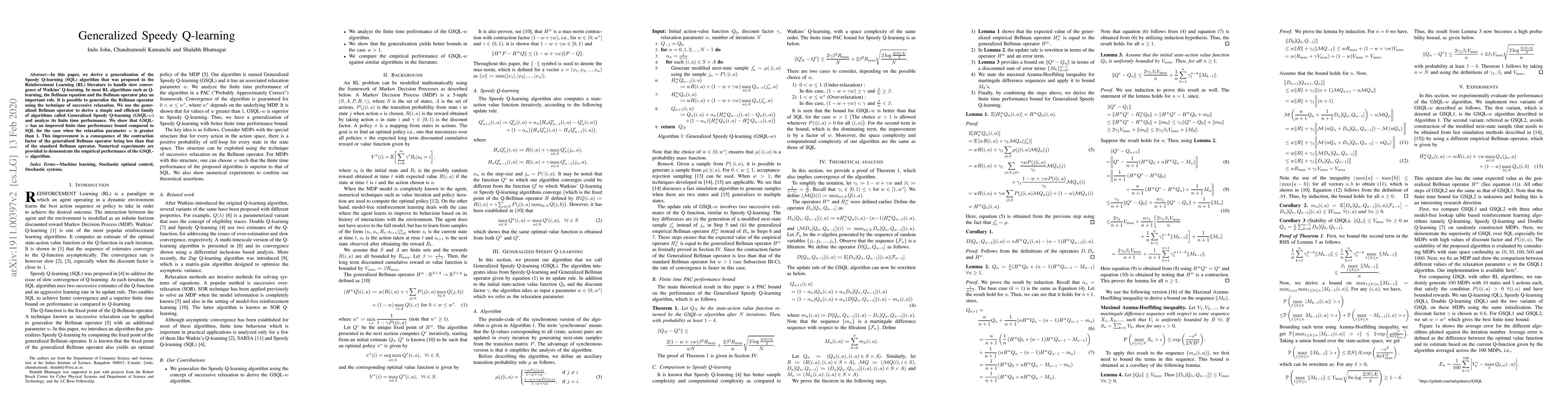 In this paper, we derive a generalization of the Speedy Q-learning (SQL) algorithm that was proposed in the Reinforcement Learning (RL) literature to handle slow convergence of Watkins' Q-learning. In most RL algorithms such as Q-learning, the Bellman equation and the Bellman operator play an important role. It is possible to generalize the Bellman operator using the technique of successive relaxation. We use the generalized Bellman operator to derive a simple and efficient family of algorithms called Generalized Speedy Q-learning (GSQL-w) and analyze its finite time performance. We show that GSQL-w has an improved finite time performance bound compared to SQL for the case when the relaxation parameter w is greater than 1. This improvement is a consequence of the contraction factor of the generalized Bellman operator being less than that of the standard Bellman operator. Numerical experiments are provided to demonstrate the empirical performance of the GSQL-w algorithm.