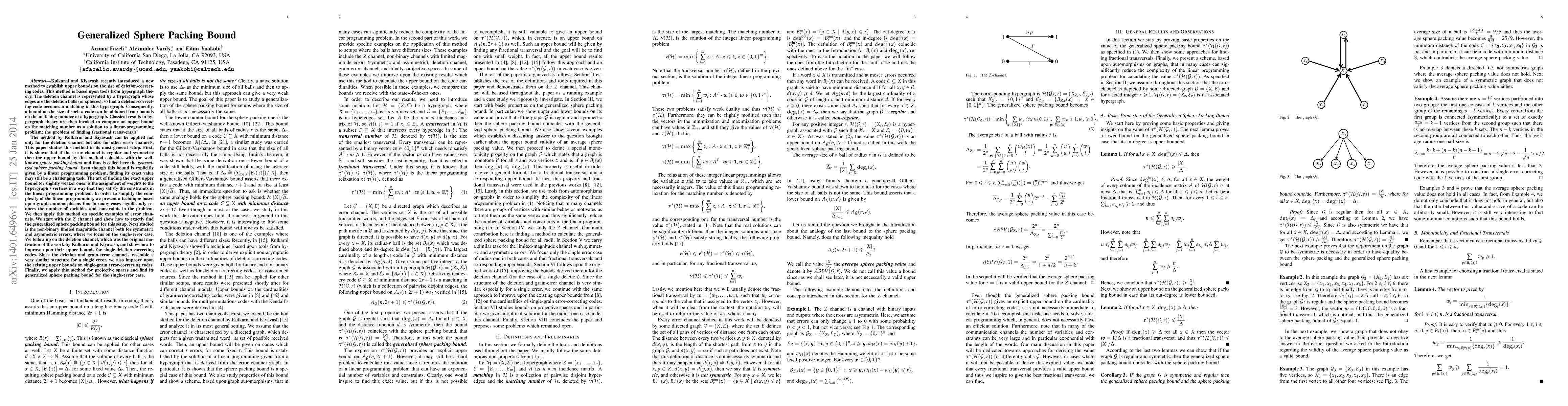 Kulkarni and Kiyavash recently introduced a new method to establish upper bounds on the size of deletion-correcting codes. This method is based upon tools from hypergraph theory. The deletion channel is represented by a hypergraph whose edges are the deletion balls (or spheres), so that a deletion-correcting code becomes a matching in this hypergraph. Consequently, a bound on the size of such a code can be obtained from bounds on the matching number of a hypergraph. Classical results in hypergraph theory are then invoked to compute an upper bound on the matching number as a solution to a linear-programming problem. The method by Kulkarni and Kiyavash can be applied not only for the deletion channel but also for other error channels. This paper studies this method in its most general setup. First, it is shown that if the error channel is regular and symmetric then this upper bound coincides with the sphere packing bound and thus is called the generalized sphere packing bound. Even though this bound is explicitly given by a linear programming problem, finding its exact value may still be a challenging task. In order to simplify the complexity of the problem, we present a technique based upon graph automorphisms that in many cases reduces the number of variables and constraints in the problem. We then apply this method on specific examples of error channels. We start with the $Z$ channel and show how to exactly find the generalized sphere packing bound for this setup. Next studied is the non-binary limited magnitude channel both for symmetric and asymmetric errors, where we focus on the single-error case. We follow up on the deletion and grain-error channels and show how to improve upon the existing upper bounds for single deletion/error. Finally, we apply this method for projective spaces and find its generalized sphere packing bound for the single-error case.