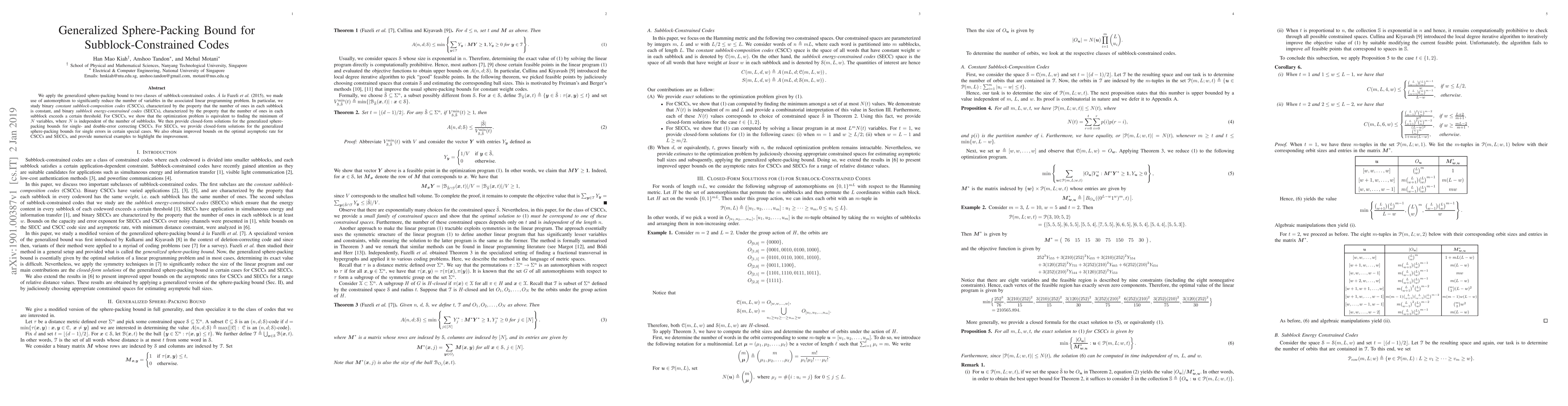 This paper applies the generalized sphere-packing bound to binary constant subblock-composition codes (CSCCs) and binary subblock energy-constrained codes (SECCs), leveraging automorphism to simplify the linear programming problem. It provides closed-form solutions for CSCCs and SECCs, and demonstrates improved bounds on their optimal asymptotic rates with numerical examples.