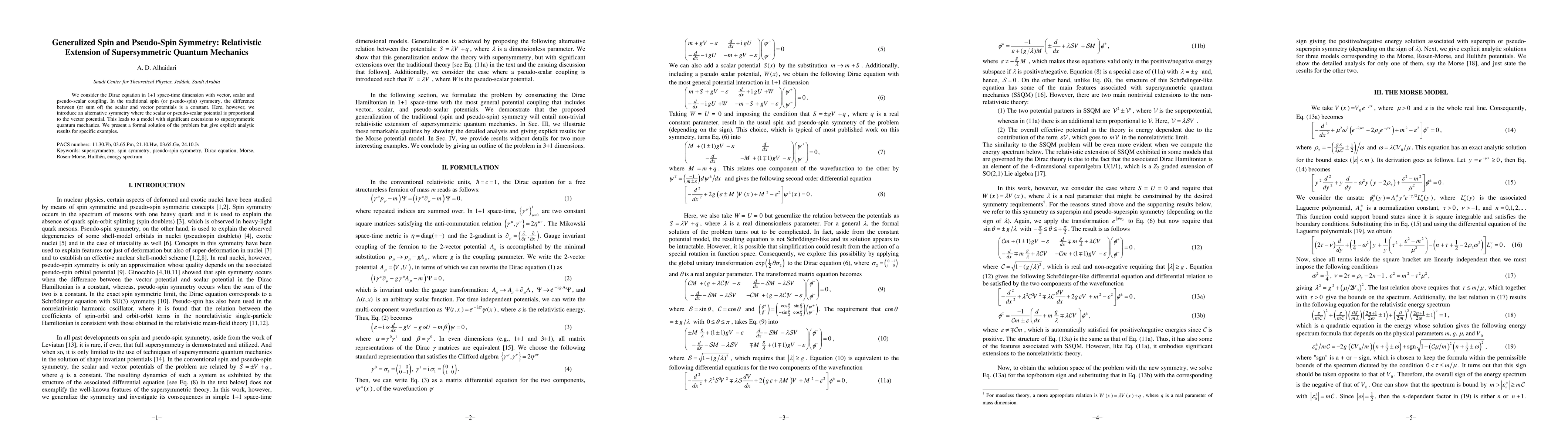 This paper explores a relativistic extension of supersymmetric quantum mechanics in 1+1 dimensions by introducing generalized spin and pseudo-spin symmetry. It proposes a novel symmetry where scalar or pseudo-scalar potentials are proportional to the vector potential, providing a significant extension to traditional models.