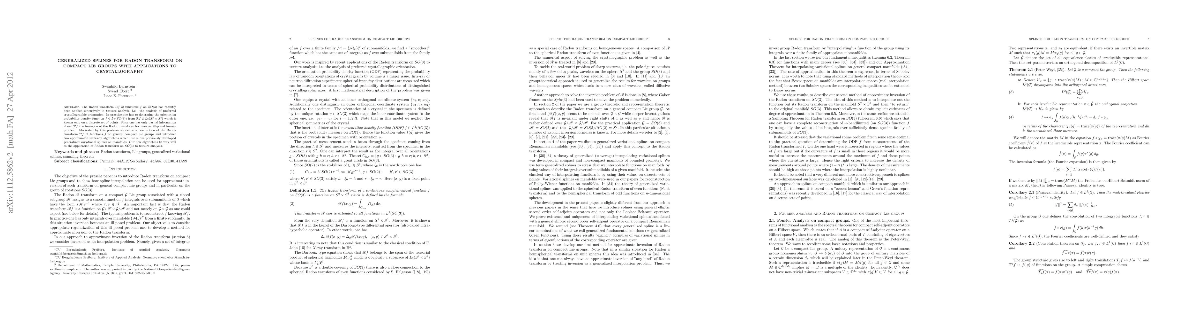 This paper introduces a generalized Radon transform for functions on compact Lie groups, specifically focusing on SO(3) for crystallographic texture analysis. It proposes two inversion algorithms using generalized variational splines to address the ill-posed inverse problem inherent in determining orientation probability density from partial data.