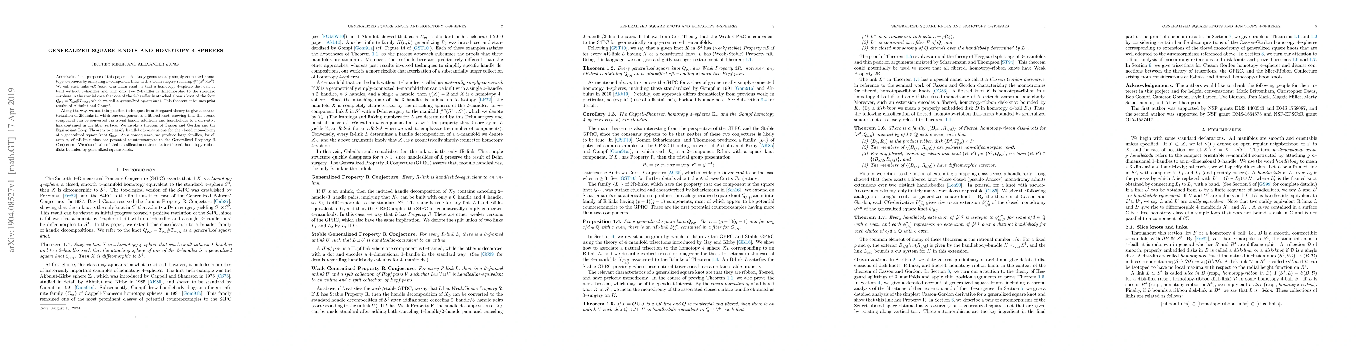 The purpose of this paper is to study geometrically simply-connected homotopy 4-spheres by analyzing $n$-component links with a Dehn surgery realizing $\#^n(S^1\times S^2)$. We call such links $n$R-links. Our main result is that a homotopy 4-sphere that can be built without 1-handles and with only two 2-handles is diffeomorphic to the standard 4-sphere in the special case that one of the 2-handles is attached along a knot of the form $Q_{p,q} = T_{p,q}\#T_{-p,q}$, which we call a generalized square knot. This theorem subsumes prior results of Akbulut and Gompf. Along the way, we use thin position techniques from Heegaard theory to give a characterization of 2R-links in which one component is a fibered knot, showing that the second component can be converted via trivial handle additions and handleslides to a derivative link contained in the fiber surface. We invoke a theorem of Casson and Gordon and the Equivariant Loop Theorem to classify handlebody-extensions for the closed monodromy of a generalized square knot $Q_{p,q}$. As a consequence, we produce large families, for all even $n$, of $n$R-links that are potential counterexamples to the Generalized Property R Conjecture. We also obtain related classification statements for fibered, homotopy-ribbon disks bounded by generalized square knots.