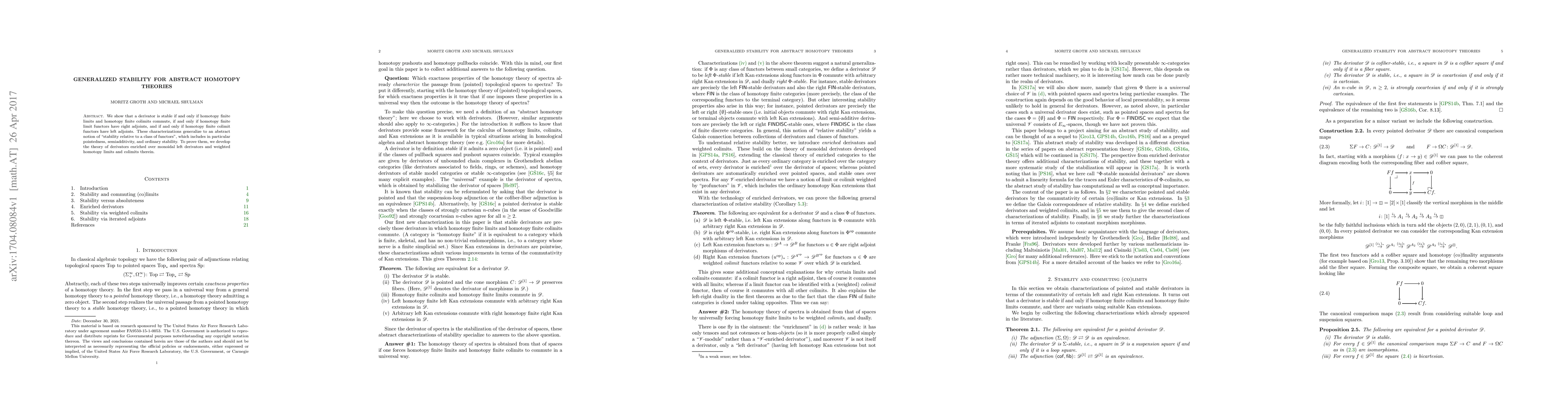 The paper proves that derivators exhibit generalized stability when homotopy finite limits and colimits commute and when corresponding functors have adjoints. It extends these characterizations to an abstract framework encompassing notions like pointedness and semiadditivity, supported by a developed theory of enriched derivators.