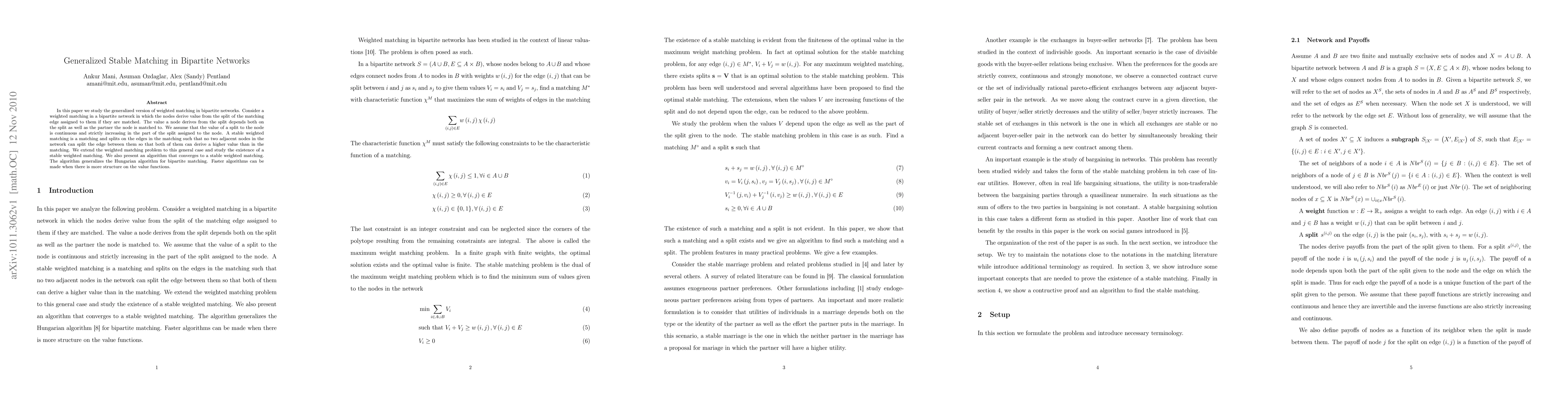 This paper explores generalized stable matching in bipartite networks where node values depend on both the split of matching edges and their partners. It presents an algorithm extending the Hungarian method to find a stable weighted matching, ensuring no adjacent nodes can improve their combined value by altering their splits.