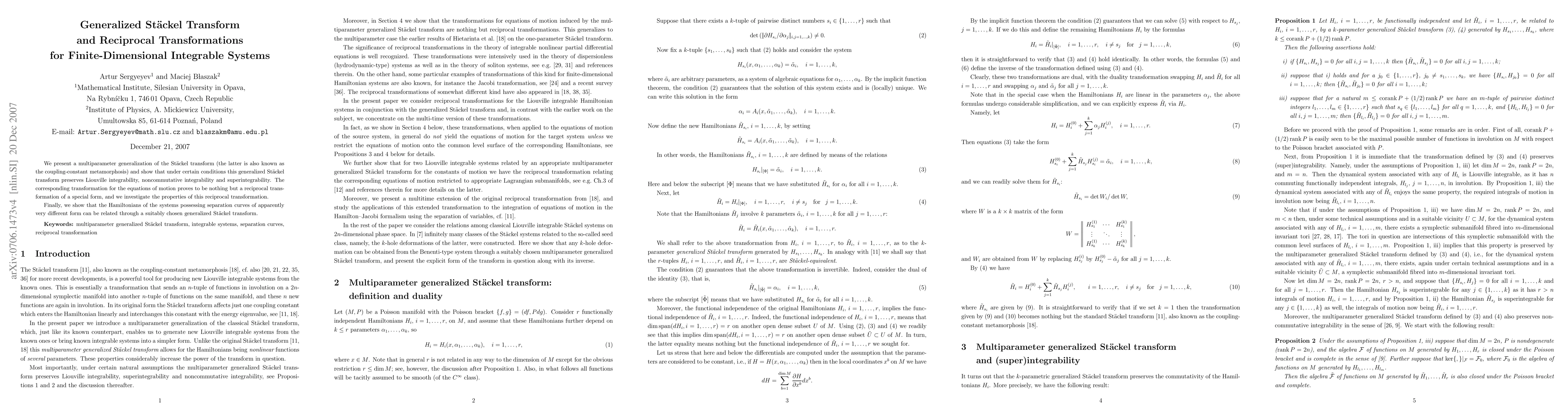 We present a multiparameter generalization of the St\"ackel transform (the latter is also known as the coupling-constant metamorphosis) and show that under certain conditions this generalized St\"ackel transform preserves the Liouville integrability, noncommutative integrability and superintegrability. The corresponding transformation for the equations of motion proves to be nothing but a reciprocal transformation of a special form, and we investigate the properties of this reciprocal transformation. Finally, we show that the Hamiltonians of the systems possessing separation curves of apparently very different form can be related through a suitably chosen generalized St\"ackel transform.