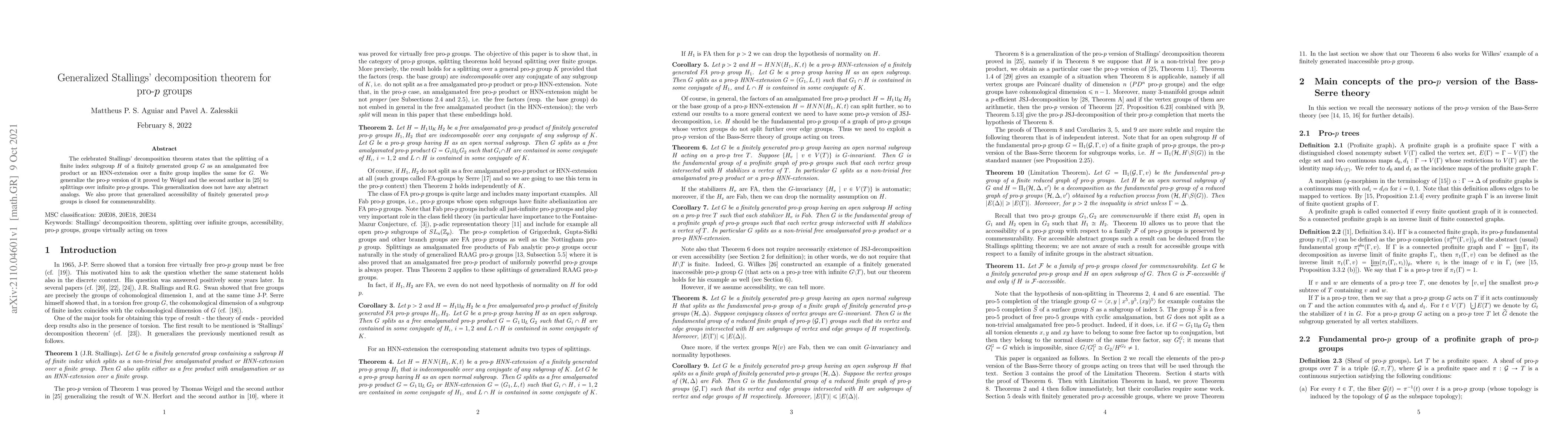 The paper generalizes Stallings' decomposition theorem to pro-$p$ groups, extending Weigel and the second author's work to infinite pro-$p$ groups, and proves the closure of generalized accessibility under commensurability for these groups.