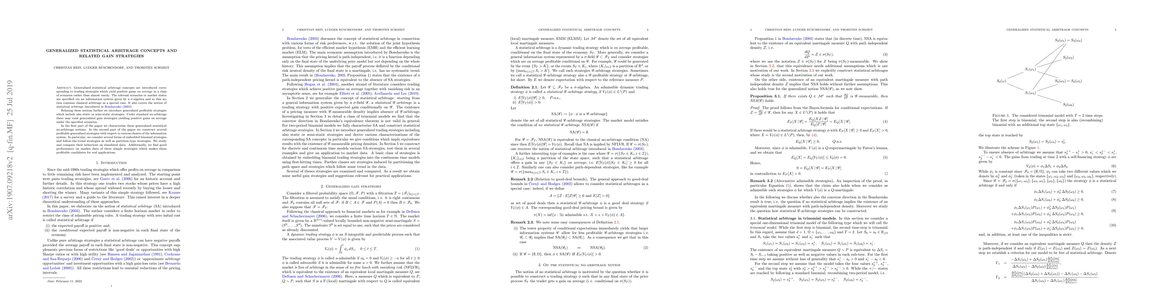 This paper introduces generalized statistical arbitrage concepts and gain strategies that yield positive average gains under specified market scenarios. It characterizes these strategies and constructs various profitable strategies, including embedded binomial, follow-the-trend, and partition-type strategies, demonstrating their effectiveness on both simulated and real market data.