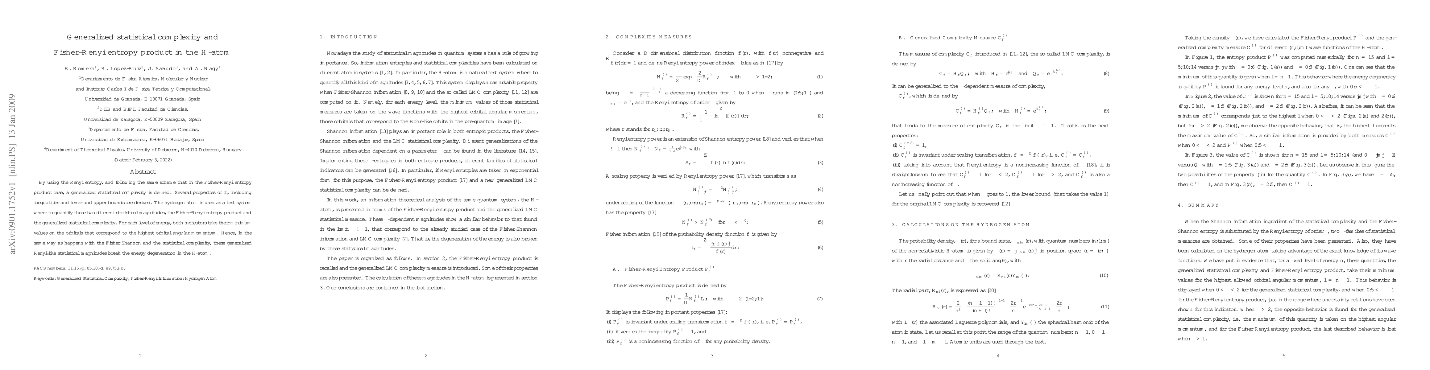 This paper defines a generalized statistical complexity using Renyi entropy, deriving properties such as inequalities and bounds. The hydrogen atom is used to test these concepts, revealing that both the generalized statistical complexity and the Fisher-Renyi entropy product reach their minimum values on orbitals with the highest orbital angular momentum, thus breaking energy degeneration.