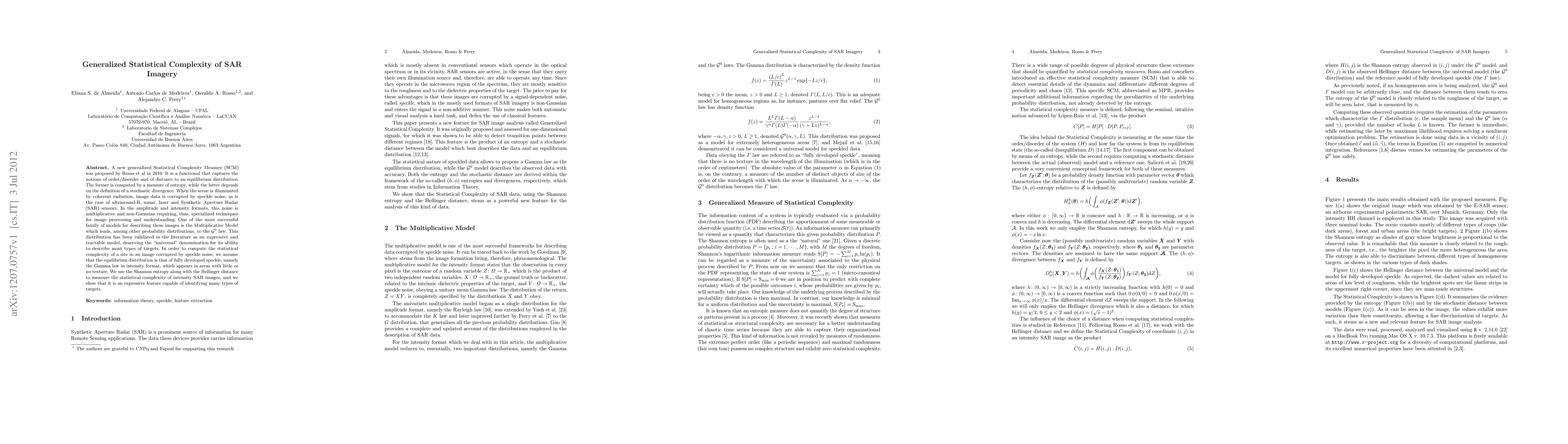 This paper proposes a new Generalized Statistical Complexity Measure (SCM) to analyze Synthetic Aperture Radar (SAR) imagery, which is often corrupted by multiplicative speckle noise. The SCM combines Shannon entropy and Hellinger distance to quantify the order/disorder and distance to the equilibrium distribution of SAR images, demonstrating its effectiveness in identifying various targets.