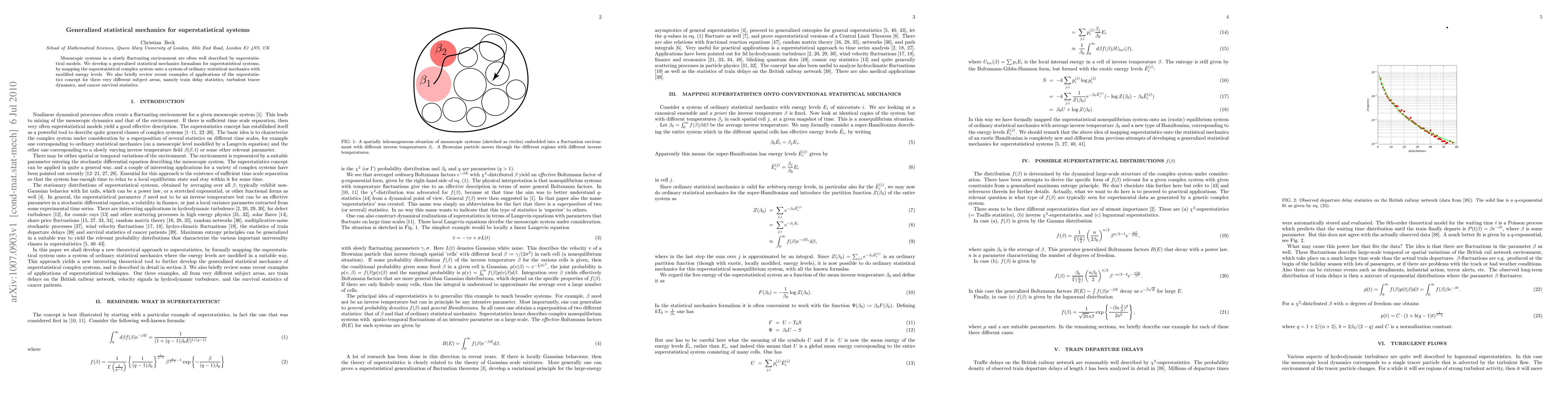 This paper develops a generalized statistical mechanics framework for superstatistical systems, transforming superstatistical models into ordinary statistical mechanics with adjusted energy levels. It also reviews applications of superstatistics in train delay statistics, turbulent tracer dynamics, and cancer survival statistics.
