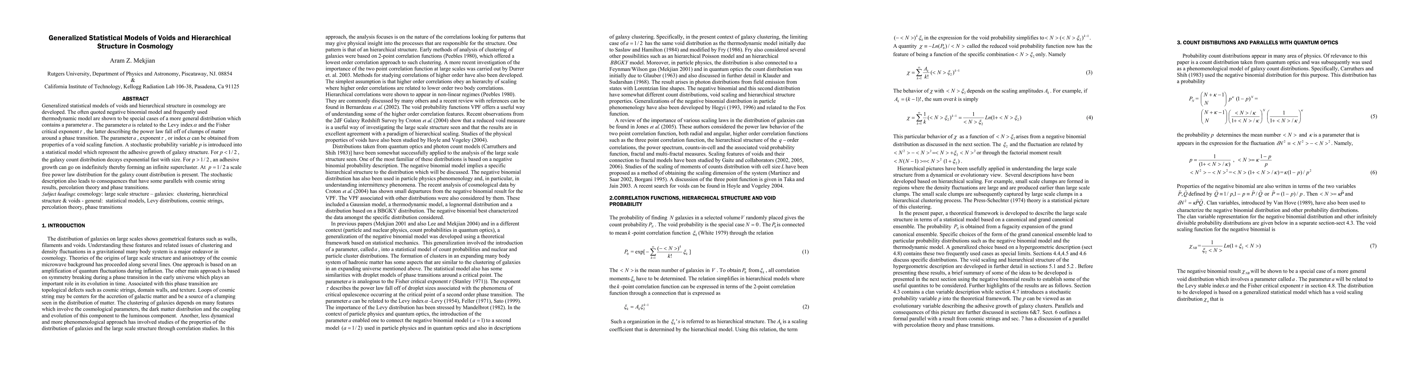 This paper develops generalized statistical models for voids and hierarchical structures in cosmology, showing that existing models are special cases of a broader distribution. It introduces a stochastic variable "p" to describe galaxy structure growth, leading to different galaxy count distributions based on the value of "p" and revealing connections to cosmic strings, percolation theory, and phase transitions.