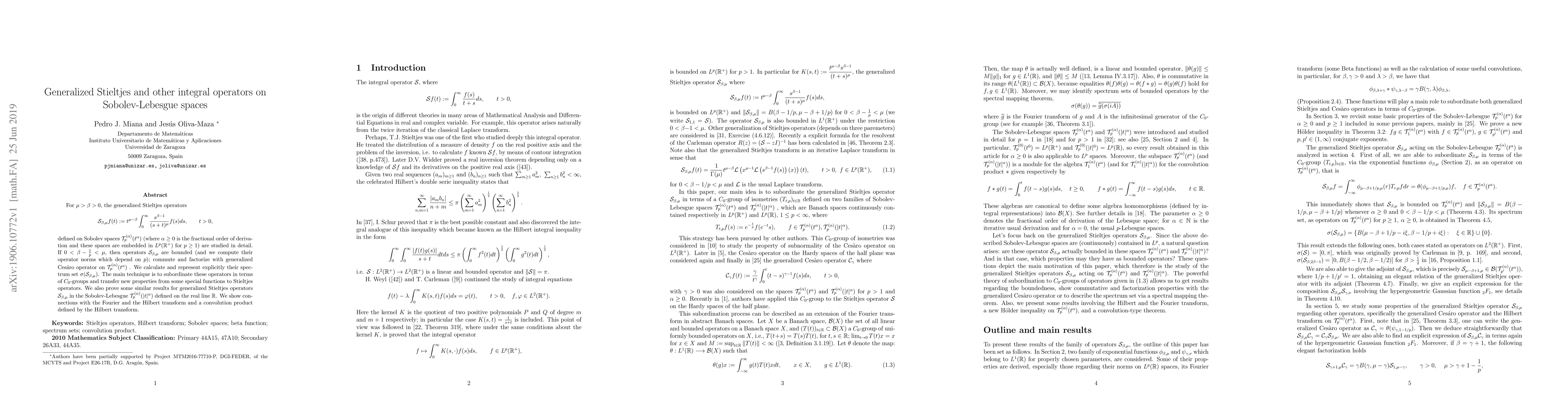 This paper studies generalized Stieltjes integral operators on Sobolev-Lebesgue spaces, proving boundedness, commutativity, and factorization properties. It computes operator norms and explicitly represents the spectrum, utilizing $C_0$-groups and special functions to transfer new properties.