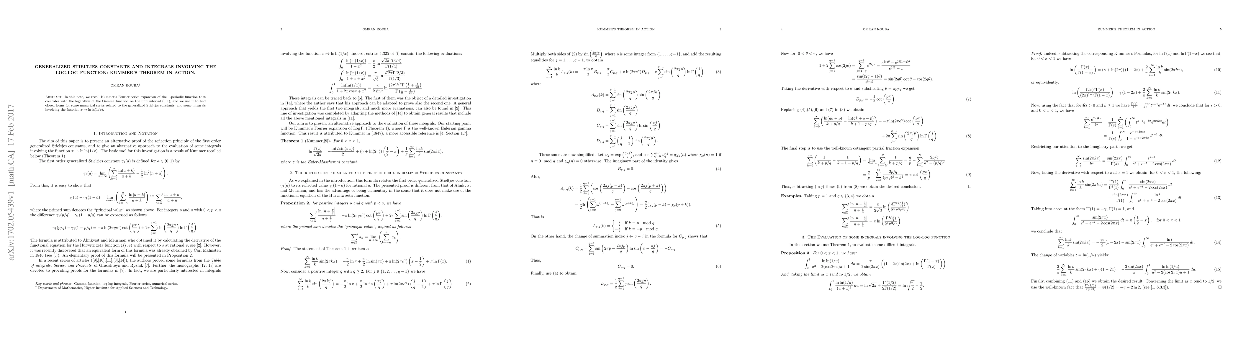In this note, we recall Kummer's Fourier series expansion of the 1-periodic function that coincides with the logarithm of the Gamma function on the unit interval $(0,1)$, and we use it to find closed forms for some numerical series related to the generalized Stieltjes constants, and some integrals involving the function $x\mapsto \ln \ln(1/x)$.